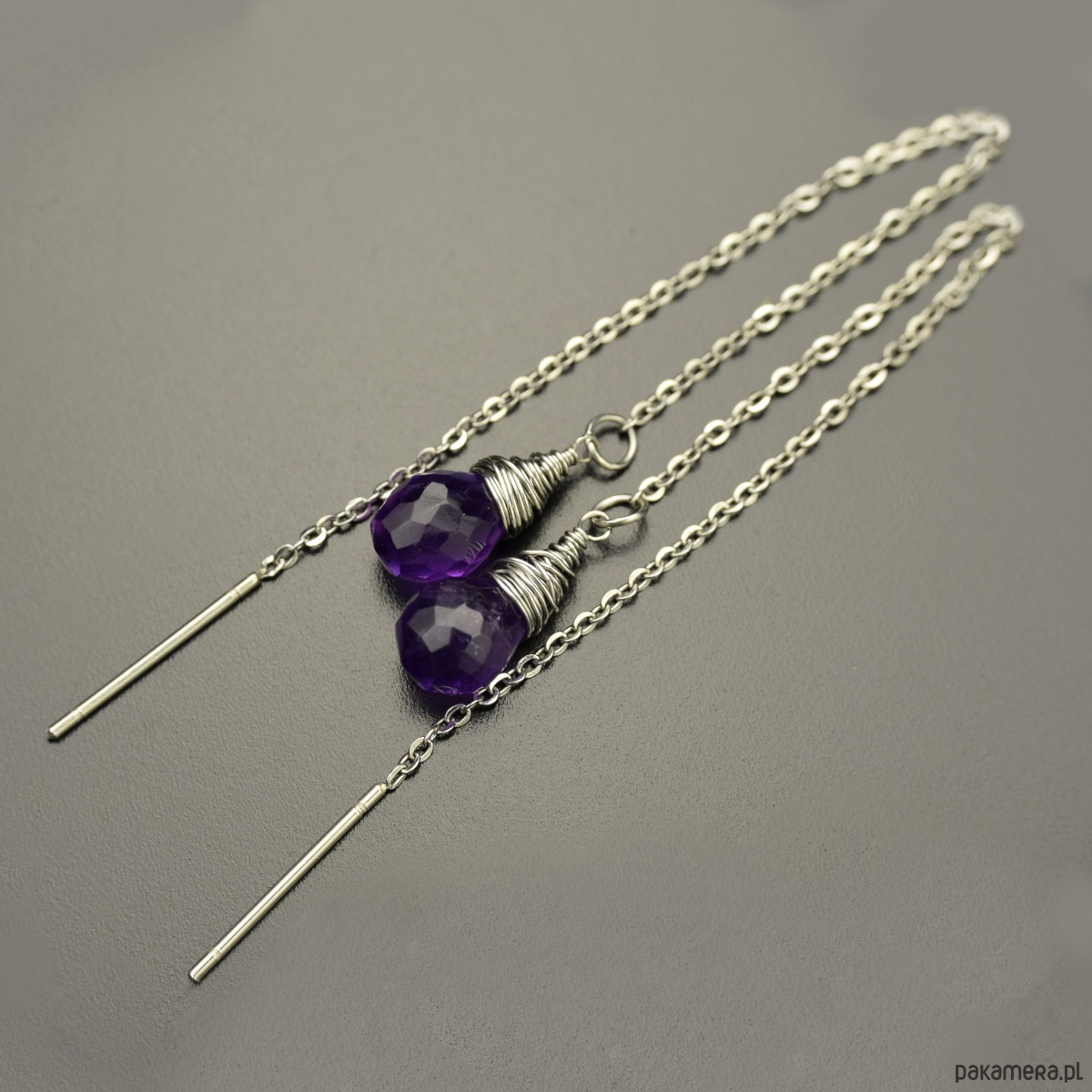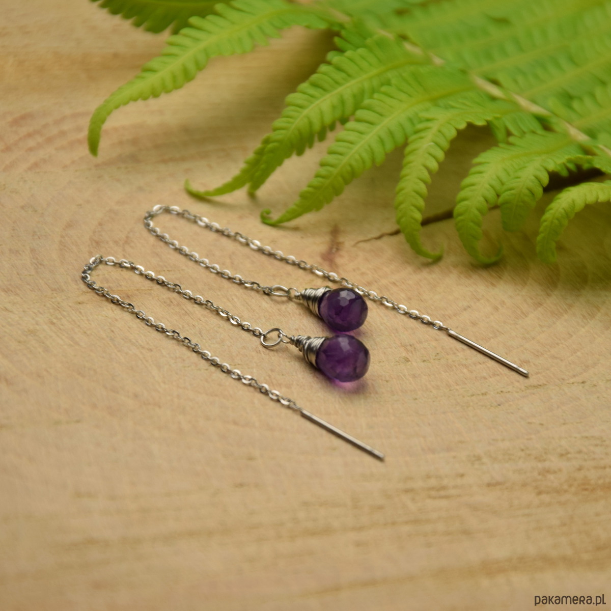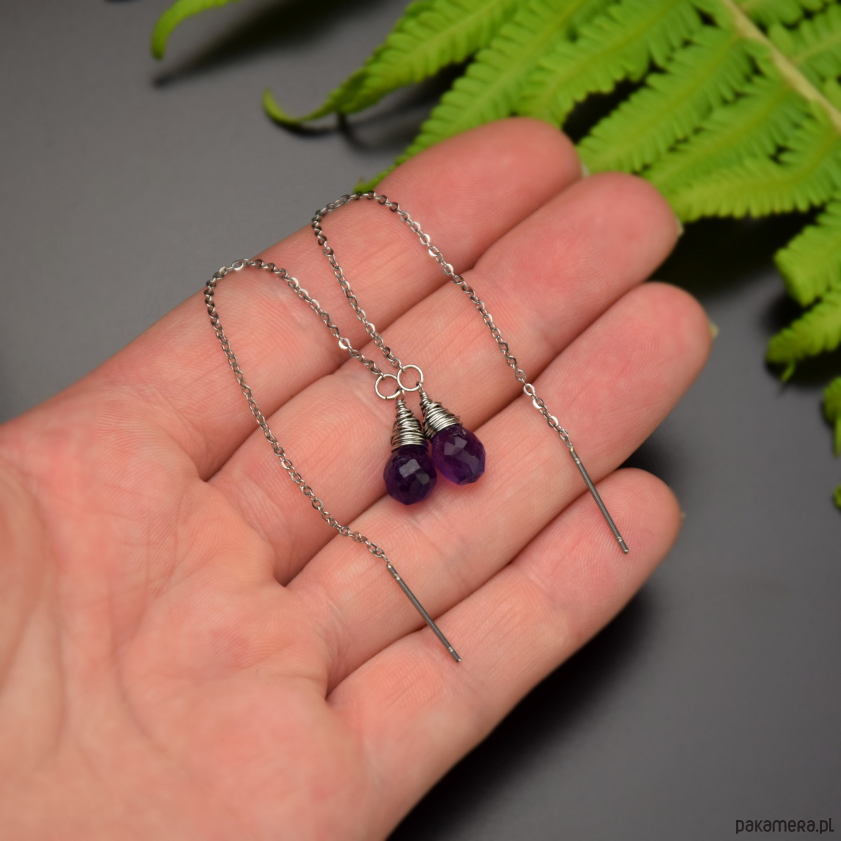 Minimalistyczne kolczyki przewlekane z kroplami ametystu, wykonane ręcznie techniką wire wrapping ze stali chirurgicznej.
