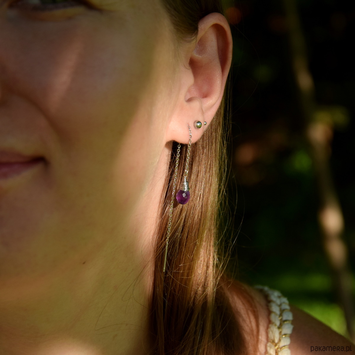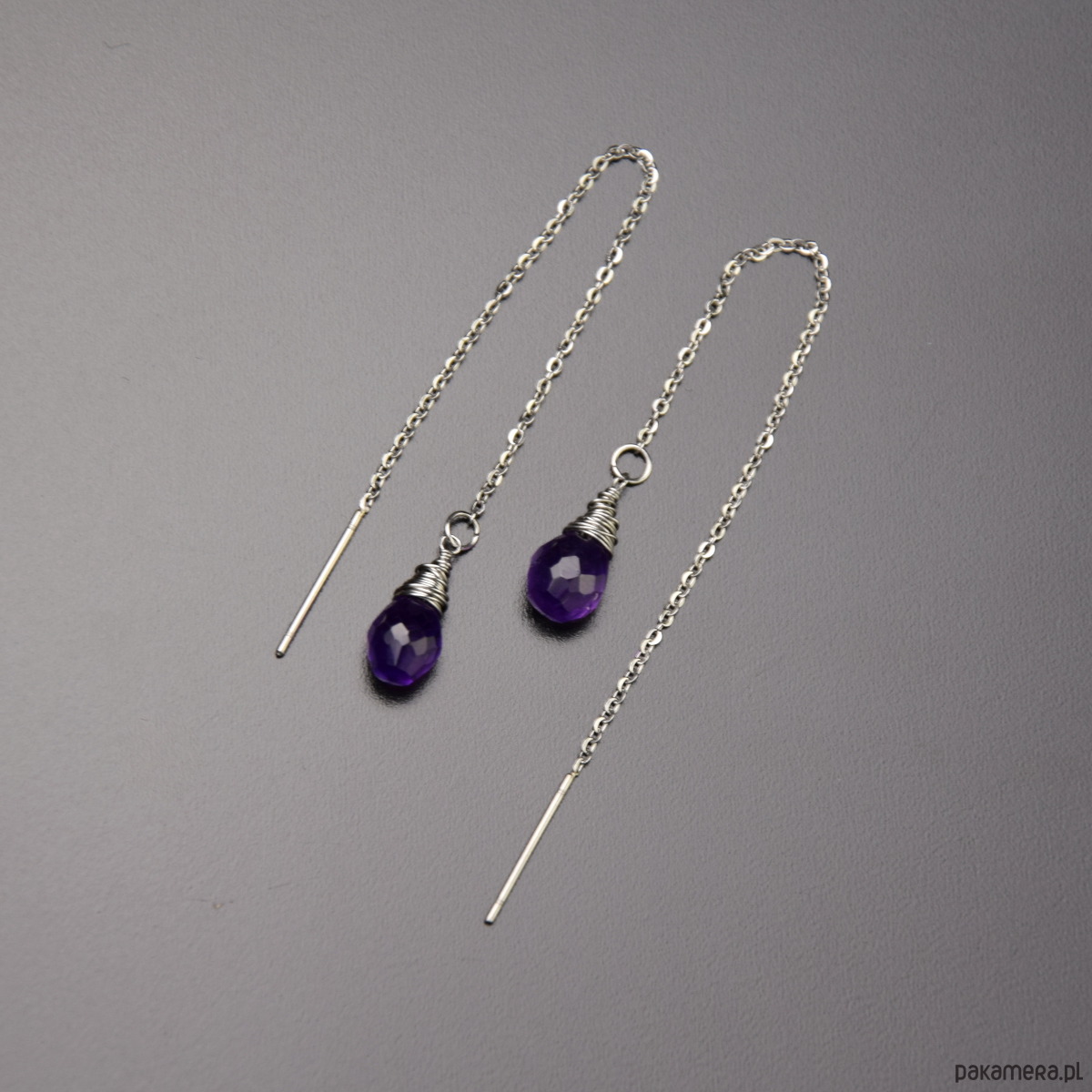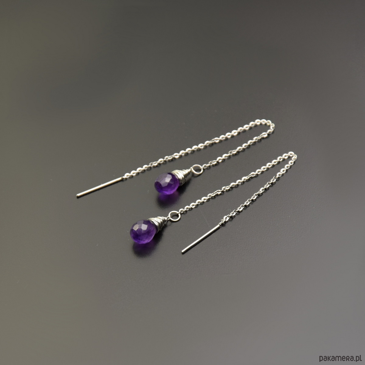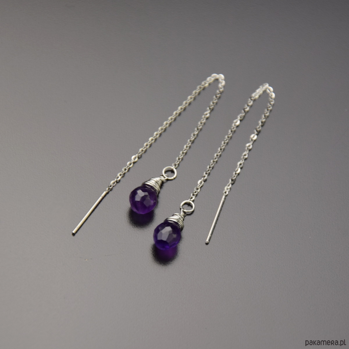 Minimalistyczne kolczyki przewlekane z kroplami ametystu, wykonane ręcznie techniką wire wrapping ze stali chirurgicznej.