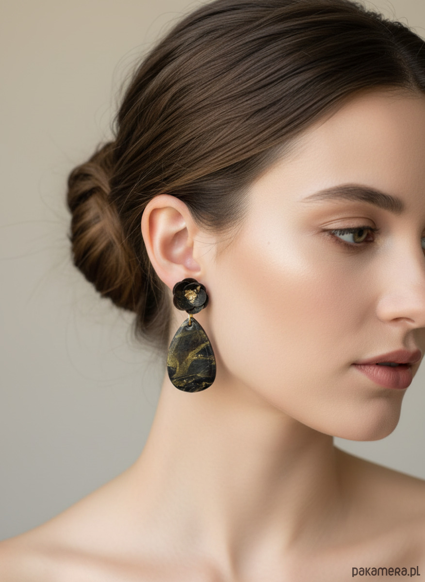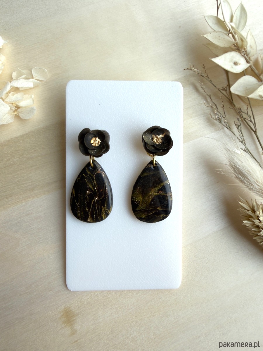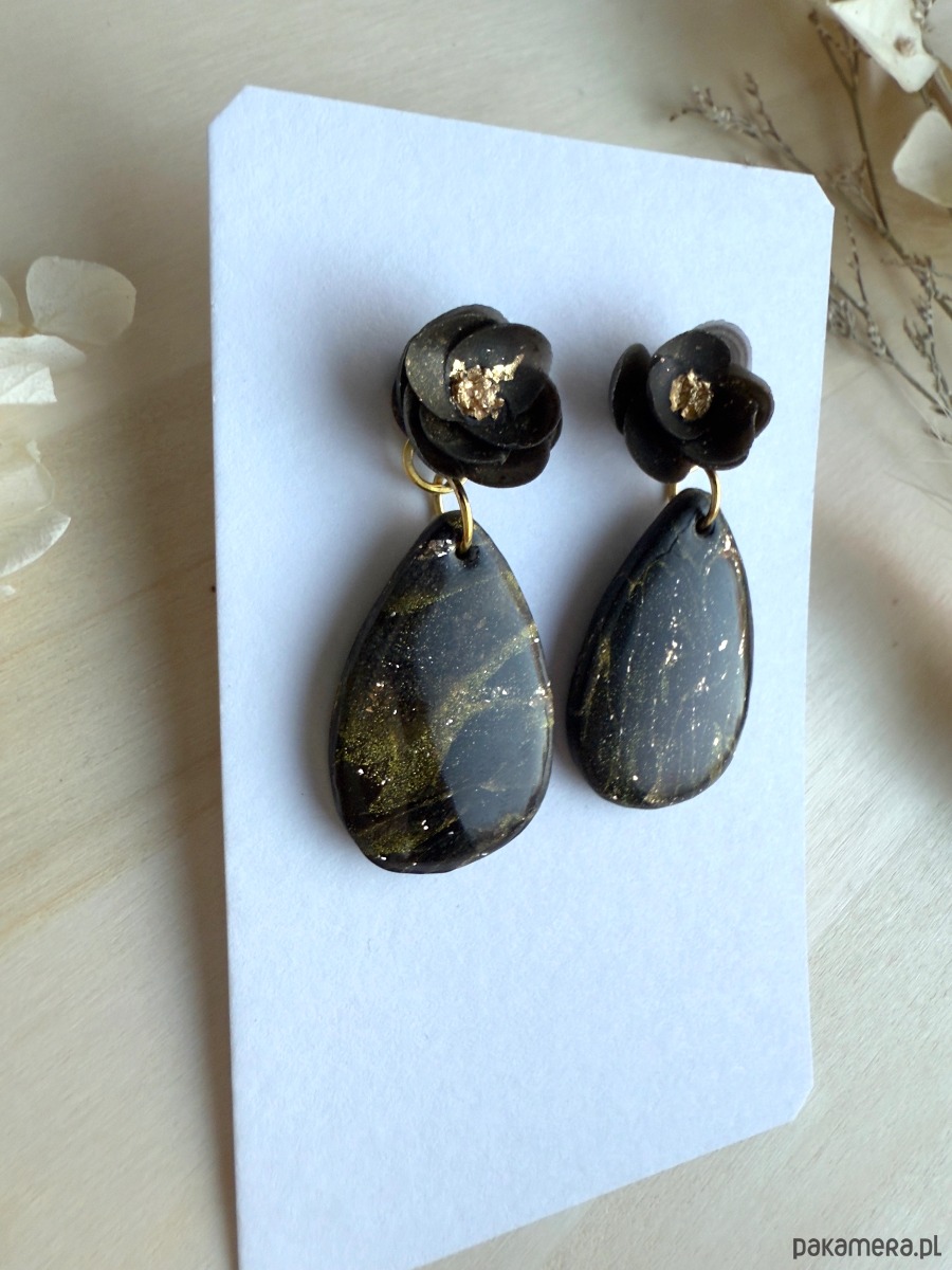 Wprowadź się w wieczorowy nastrój z kolczykami, które łączą trójwymiarowe, czarne róże z połyskującymi, kroplami w odcieniach czerni i złota! Delikatne żyłkowanie i złote drobinki na powierzchni kropli tworzą efekt marmuru, a złota folia w środku kwiatów subtelnie odbija światło przy każdym ruchu. Kolczyki zostały wykonane z wysokiej jakości gliny polimerowej, a sztyfty wykonano ze stali chirurgicznej i pozłacanych dodatków, co zapewnia trwałość oraz komfort noszenia.