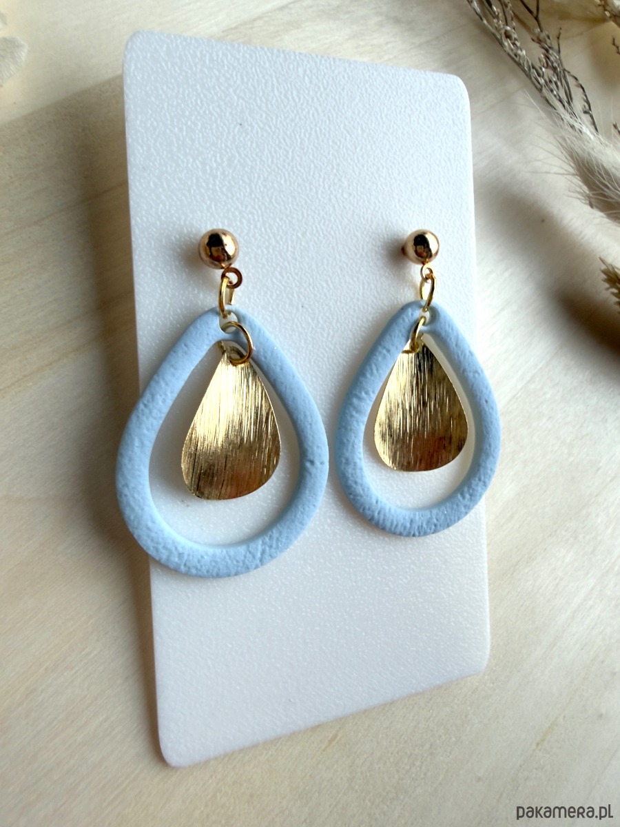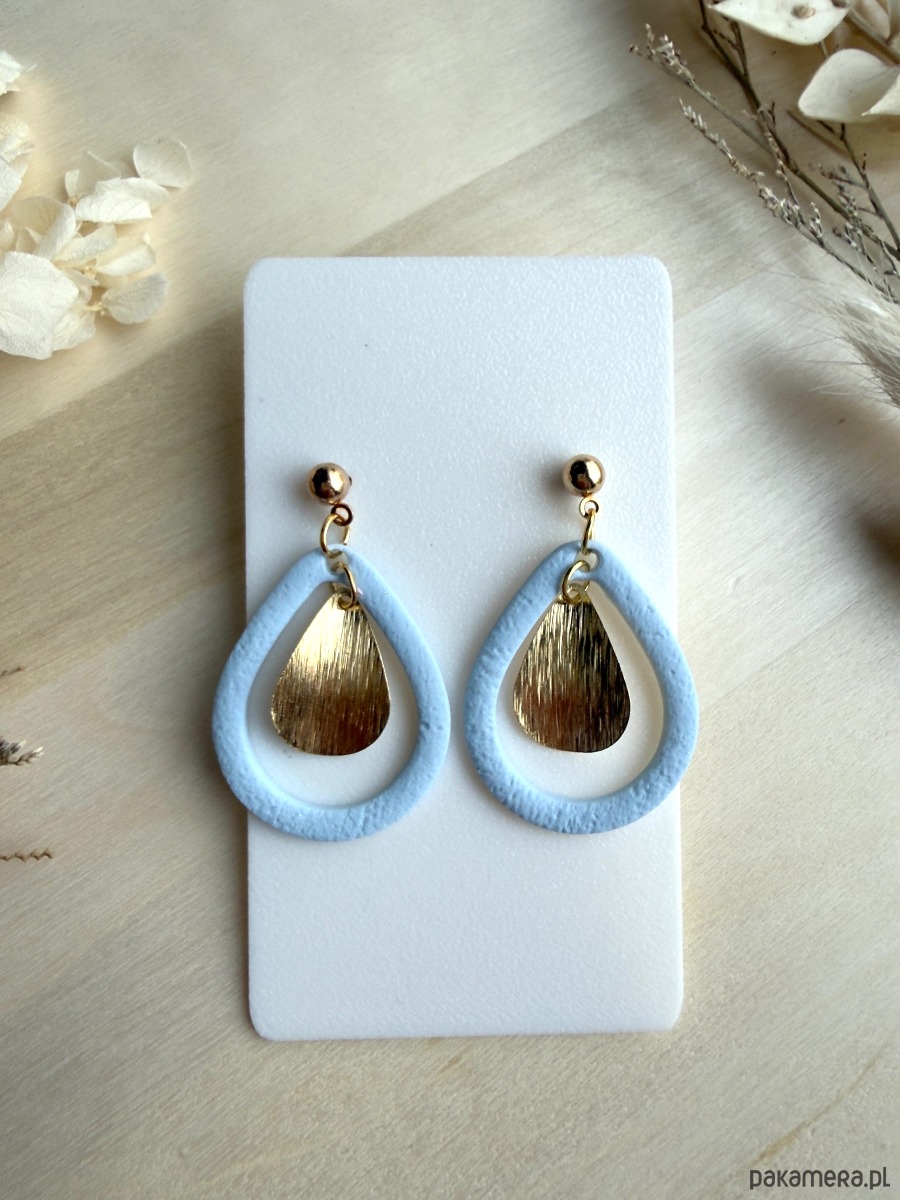 Wprowadź się w subtelnie elegancki nastrój dzięki połączeniu pastelowego błękitu z ciepłym blaskiem szczotkowanego złota, które pięknie odbija światło przy każdym ruchu głowy. Matowa, lekko „pudrowa” powierzchnia ramki z gliny kontrastuje z lustrzaną, złotą kroplą, nadając kolczykom nowoczesny, biżuteryjny charakter, mimo niewielkich rozmiarów.