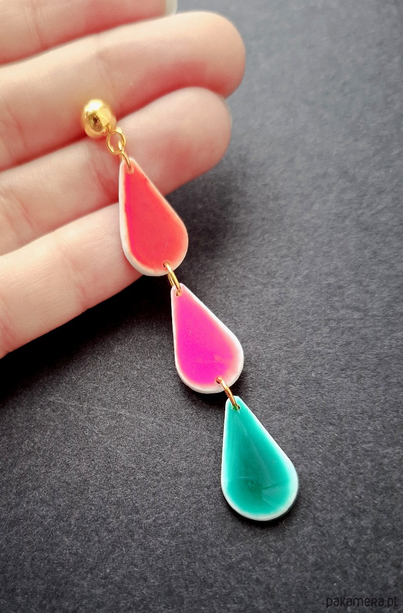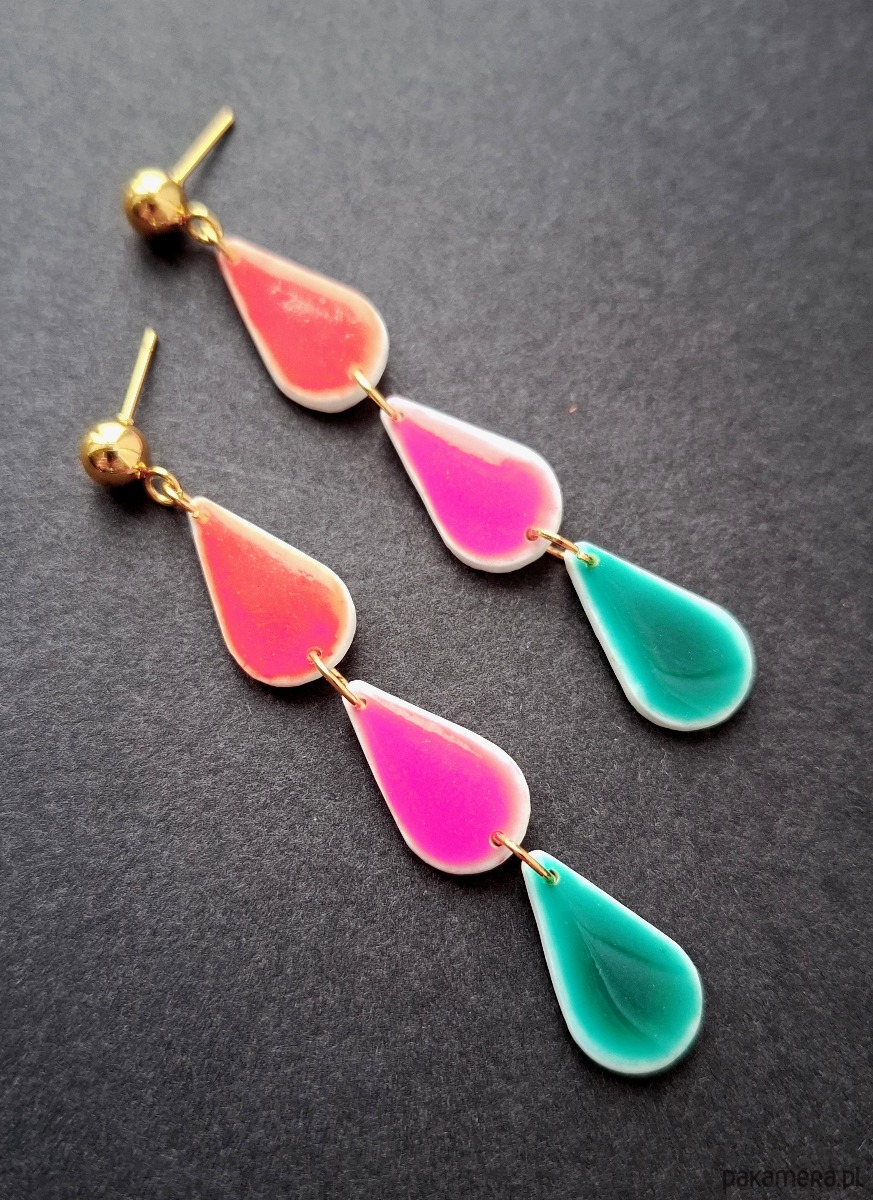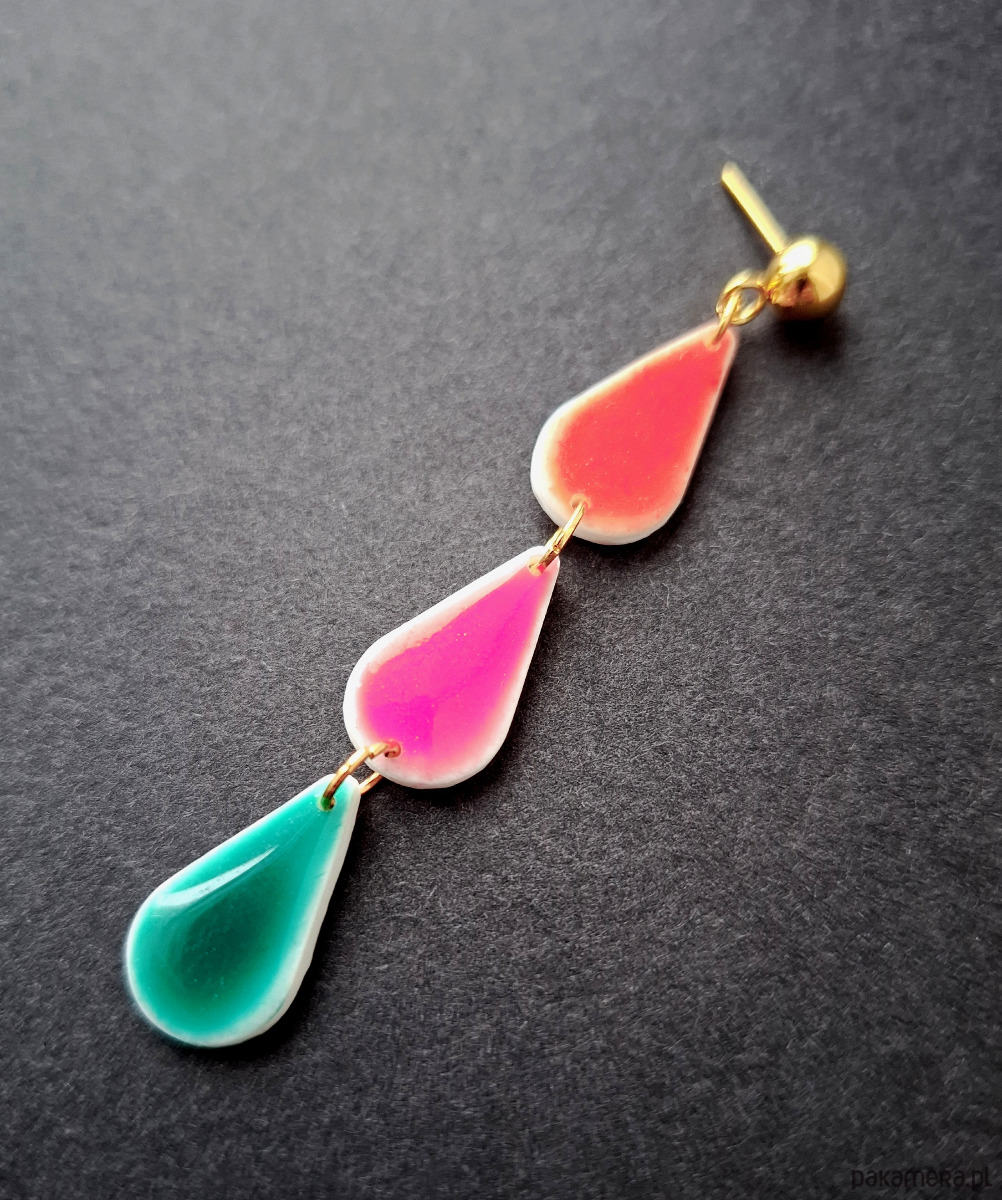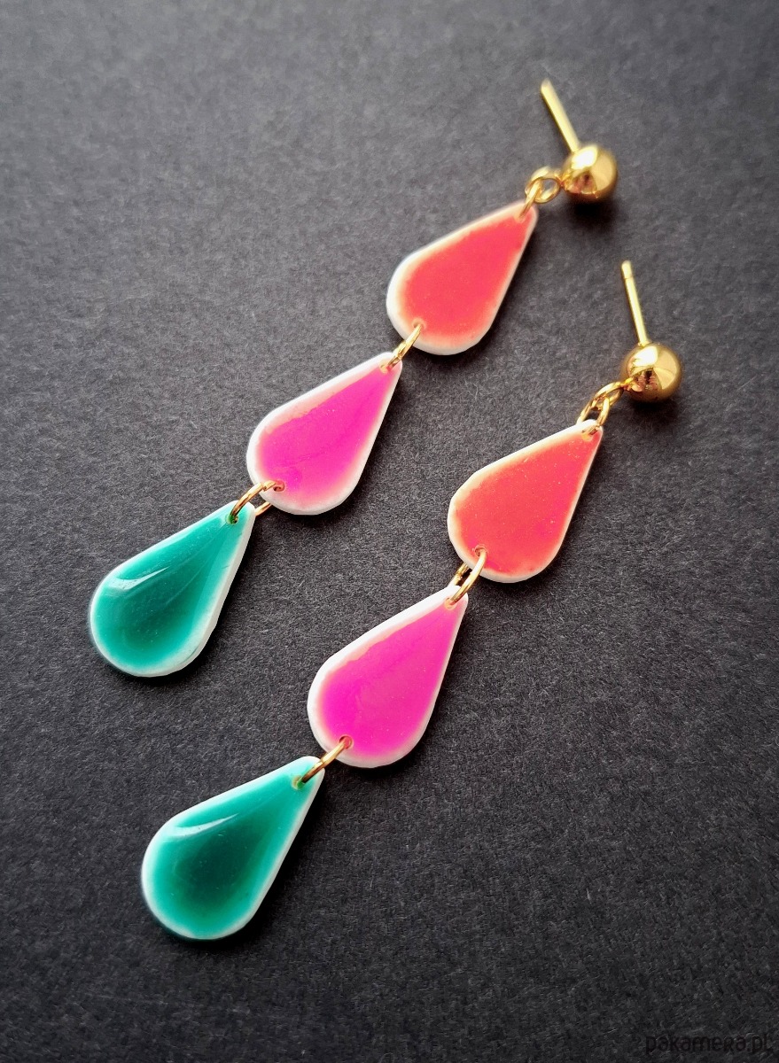 Kolczyki na sztyfty wykonane z wysokiej jakości glinki polimerowej. Kolczyki jednostronne, podwieszone na pozłacanych i nieuczulających sztyftach z zapięciem na klasyczne baranki. Wymiary: długość całkowita: 7 cm, szerokość max 1 cm.