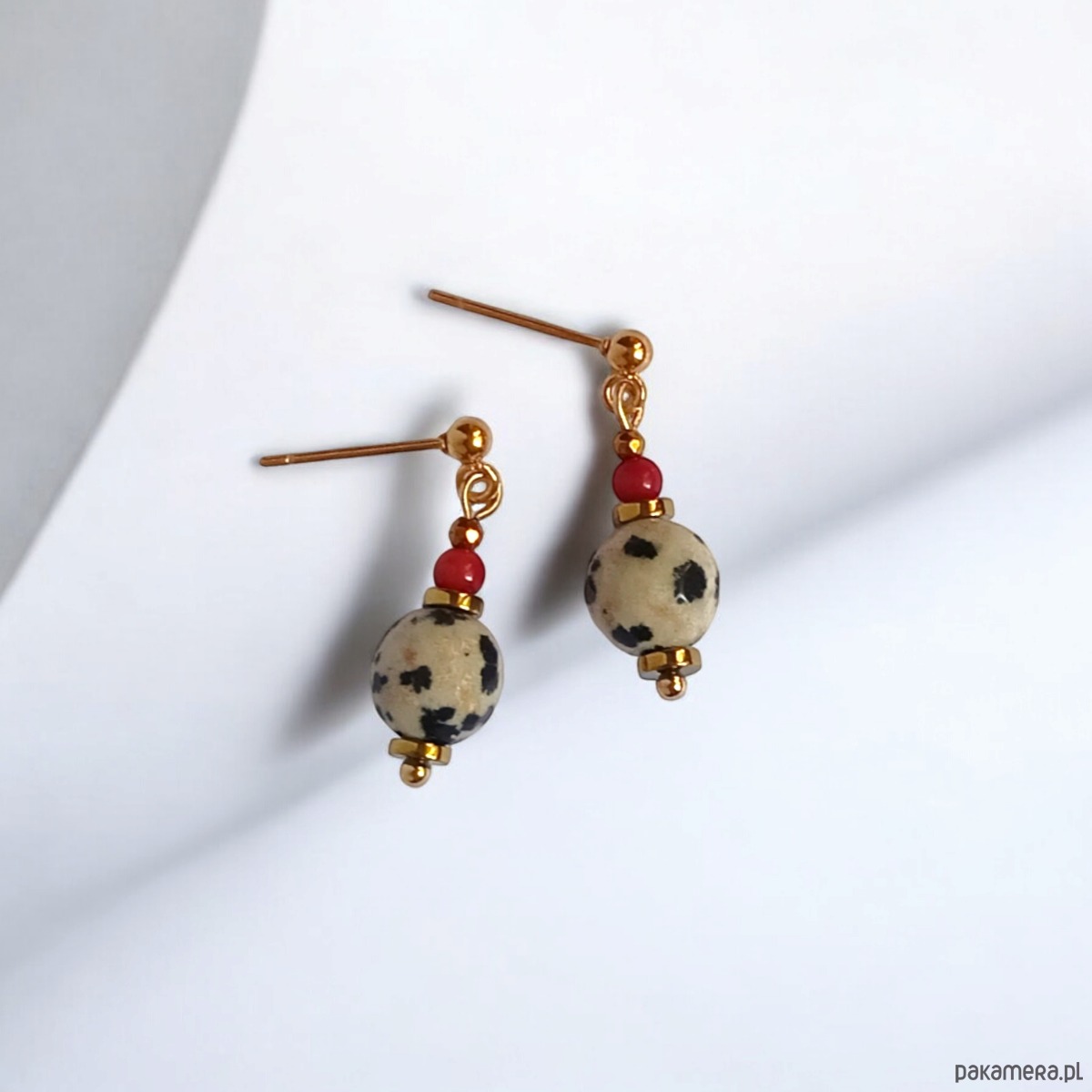Wykonane z połączenia jaspisu dalmatyńskiego (fasetowane kule 8mm) , czerwonego korala 3mm oraz przekładek ze złotego hematytu.