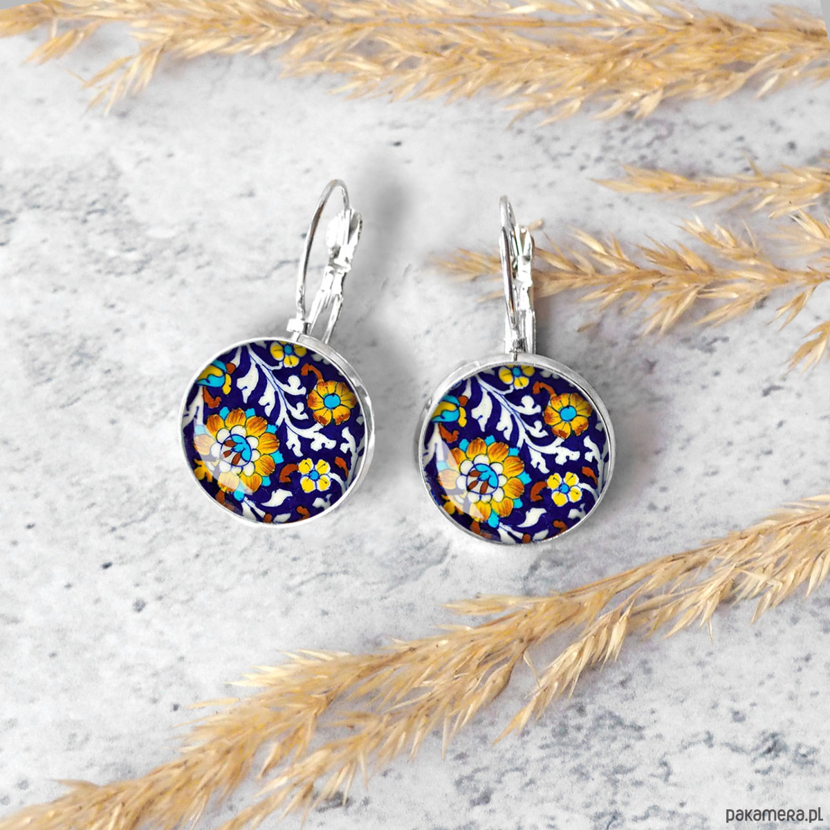 • Interesujące kolczyki zapinane, z grafiką artystyczną, zatopioną pod wypukłym szkiełkiem, dzięki któremu grafika nabiera trójwymiarowego wyrazu, w oprawie w kolorze srebrnym.