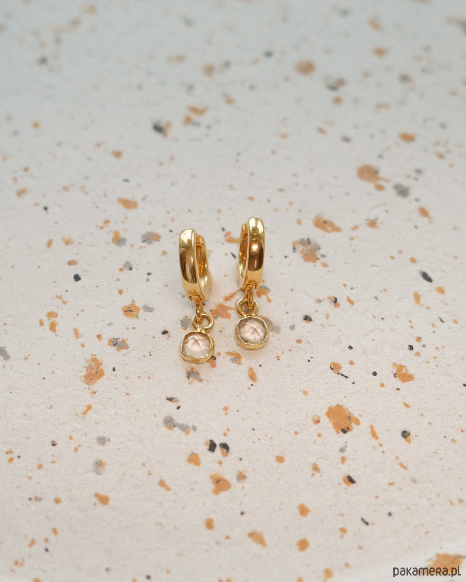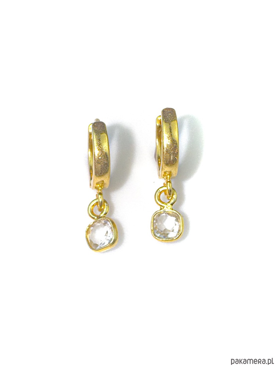 Delikatne kolczyki z fasetowanymi kryształkami, oprawionymi w srebro próby 925, pokryte 24 karatowym złotem. Zawieszone na sztyftach.