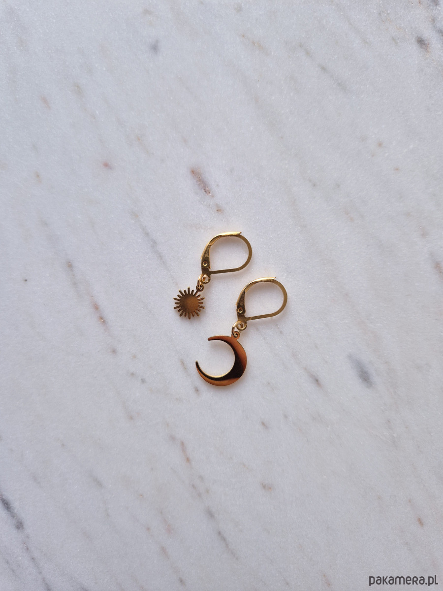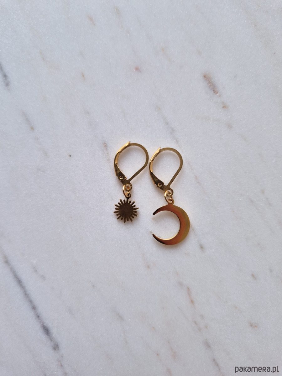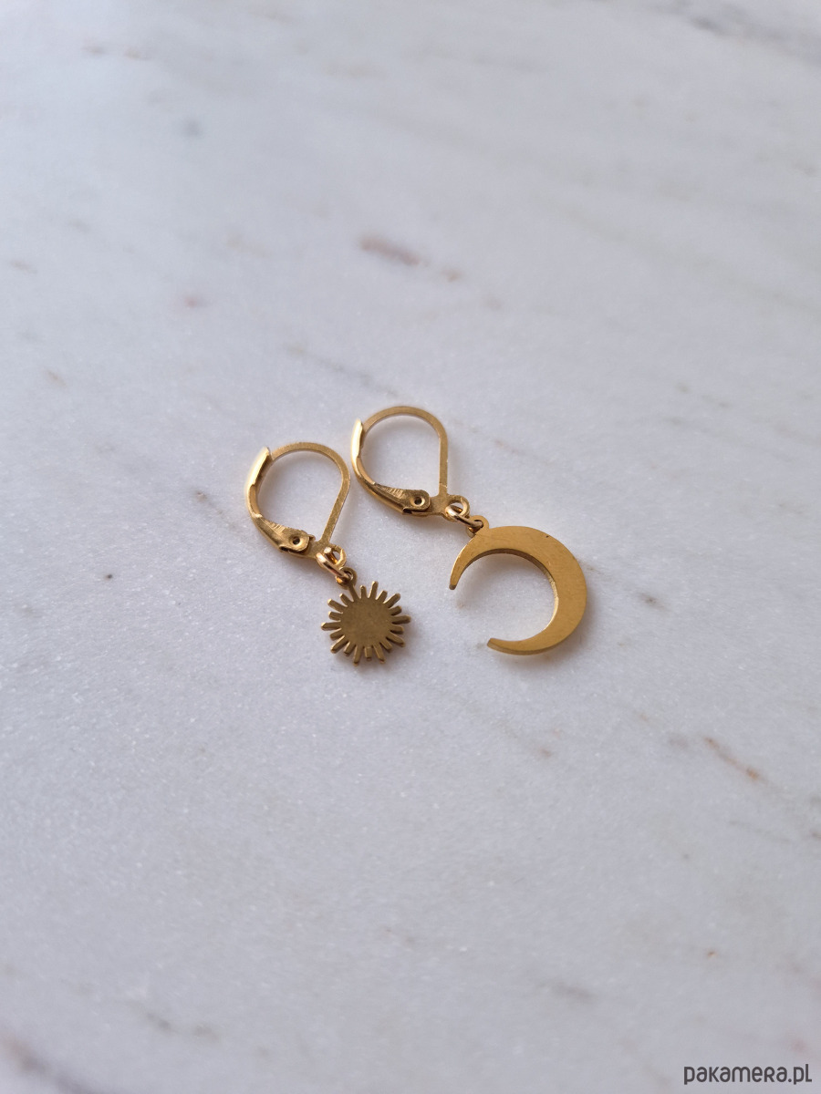 Delikatne kolczyki z zawieszkami - księżyc i słońce. Całość (bigle również) są ze stali chirurgicznej: nie uczula, nie zmienia koloru.