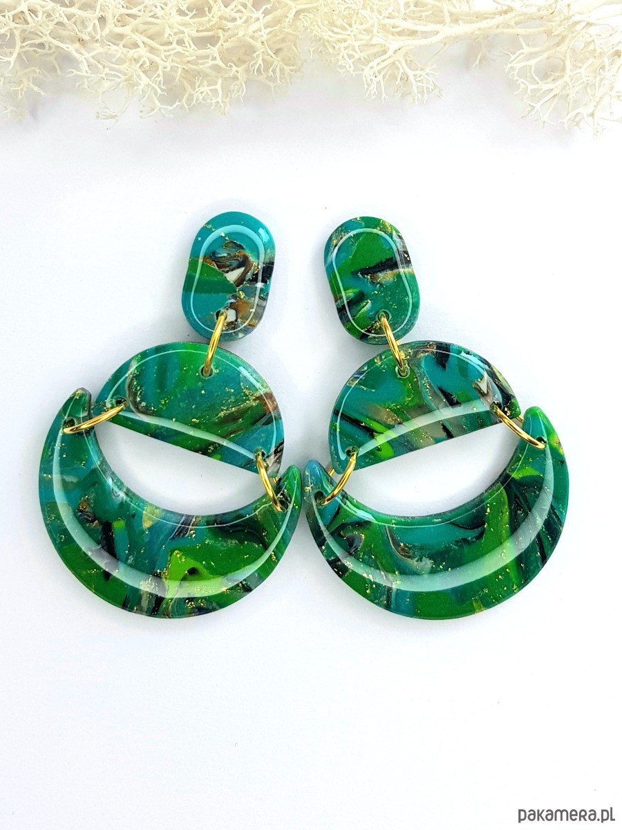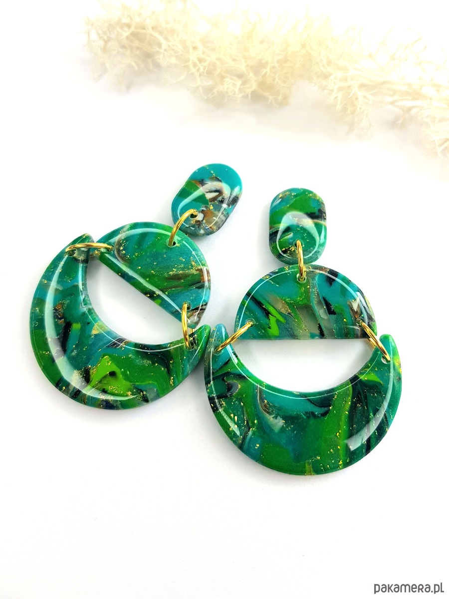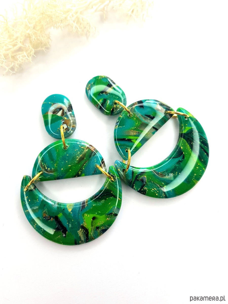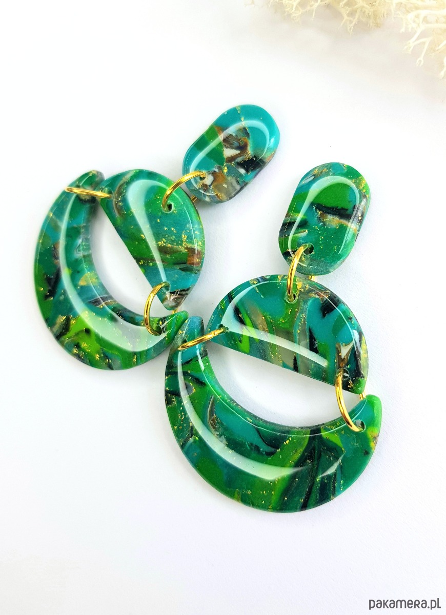 Zielone kolczyki z drobinkami złota wykonane ręcznie z glinki polimerowej.