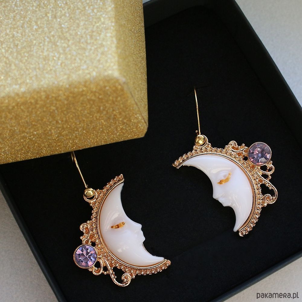 Autorskie ręcznie malowane kolczyki emaliowe na bazie ze stopu miedzi i cynku, bez niklu ołowiu i kadmu, hypoalregiczne, w odcieniu złotym. Bigle ze srebra próby 925 pozłacane 24k złotem. Kolczyki są lekkie.