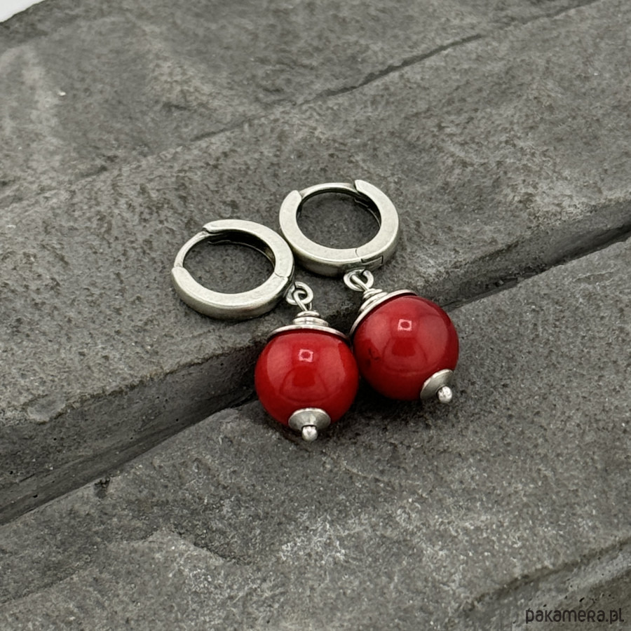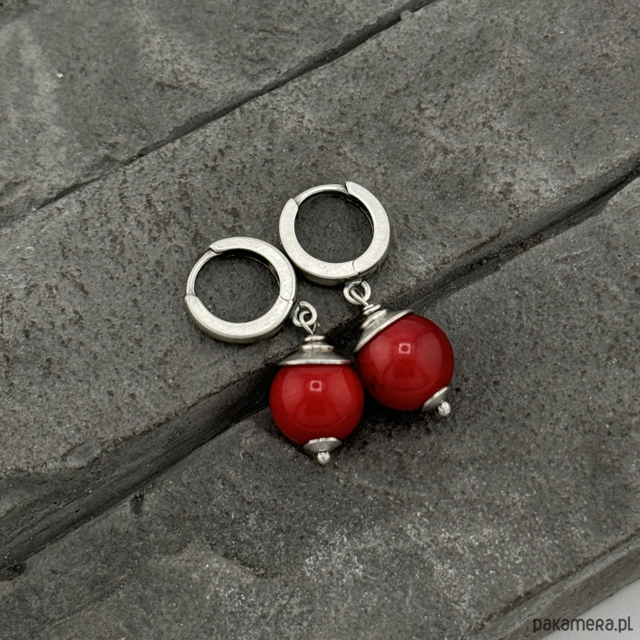 Minimalistyczne kolczyki na co dzień. Wykonane w całości z oksydowanego srebra próby 925 oraz gładkich kul czerwonego korala wielkosci ok. 1,1 cm. Zapięcia typu kajdanki, zatrzaskowe. Całkowita długość kolczyków to ok. 3 cm. Ozdobnie zapakowane.