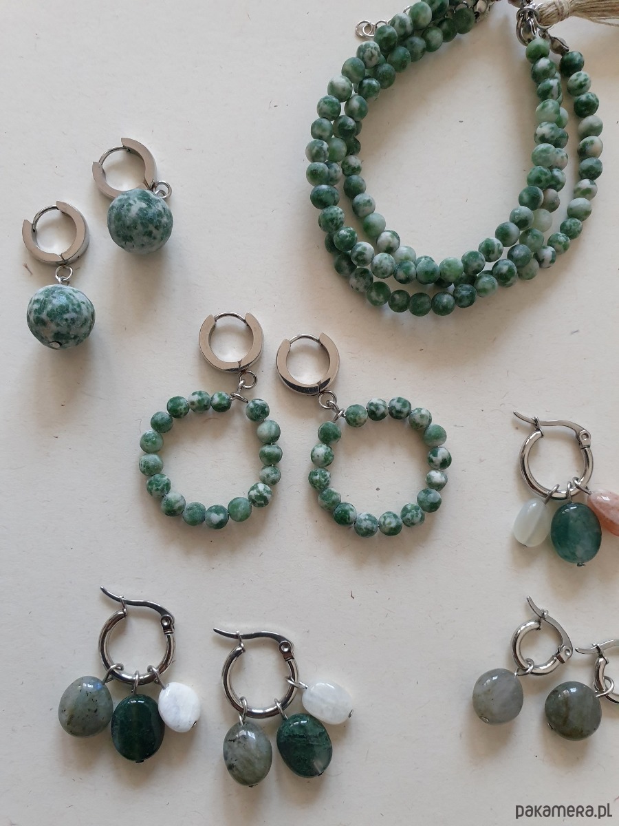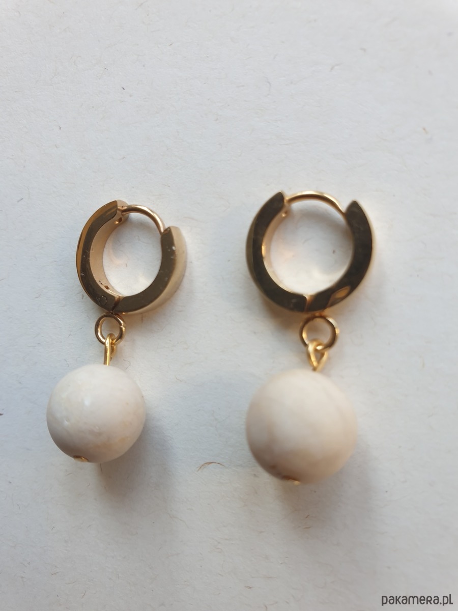 Drobne kolczyki z kulką- kamień rzeczny, idealne na wieczorne wyjście ale też na co dzień. Pasują do bransoletek z tym samym kamieniem i naszyjnika dostępnych w naszym sklepie. Na zdjęciu przykładowa para, kolczyki które kupujesz będą się minimalnie różnić bo każdy kamień jest wyjątkowy.