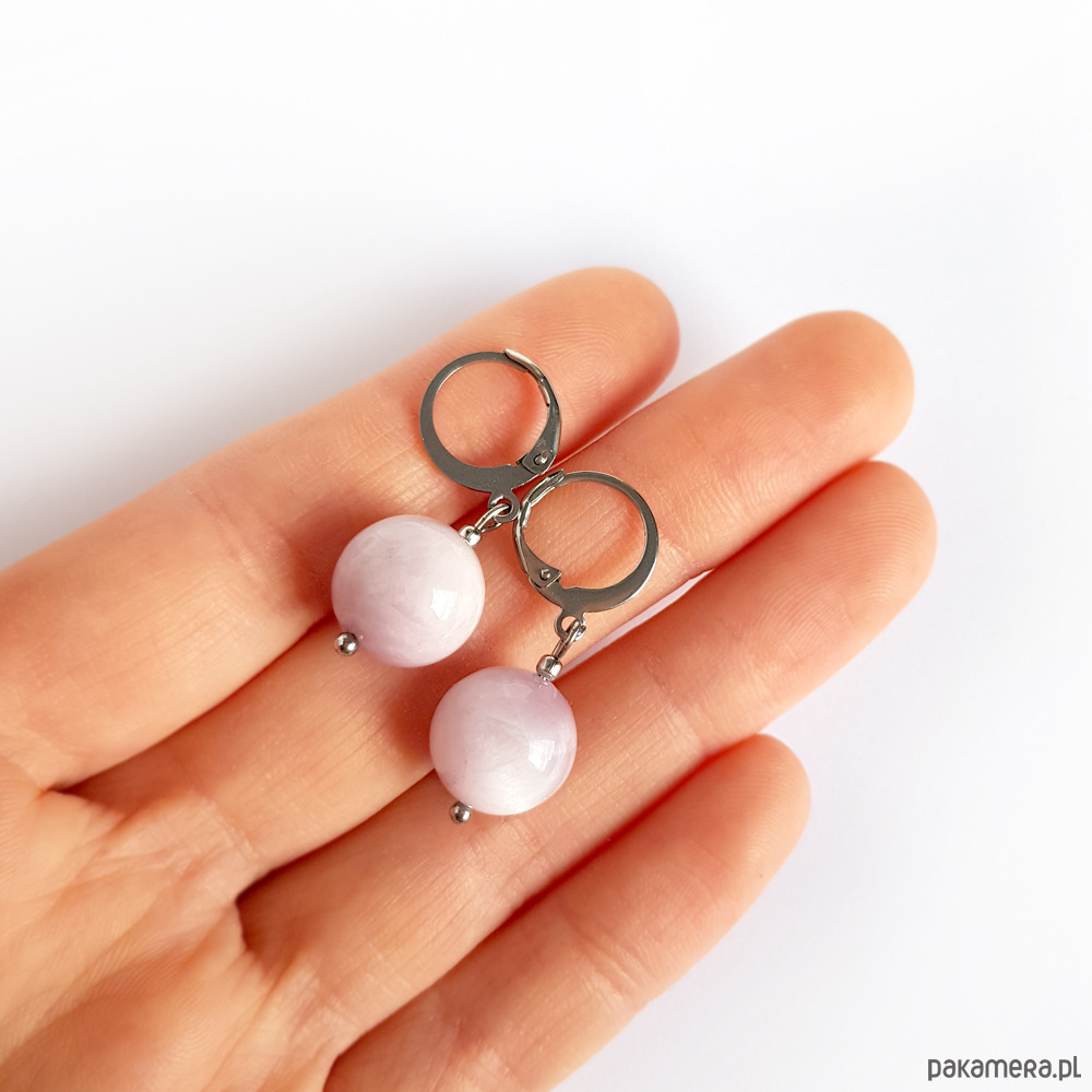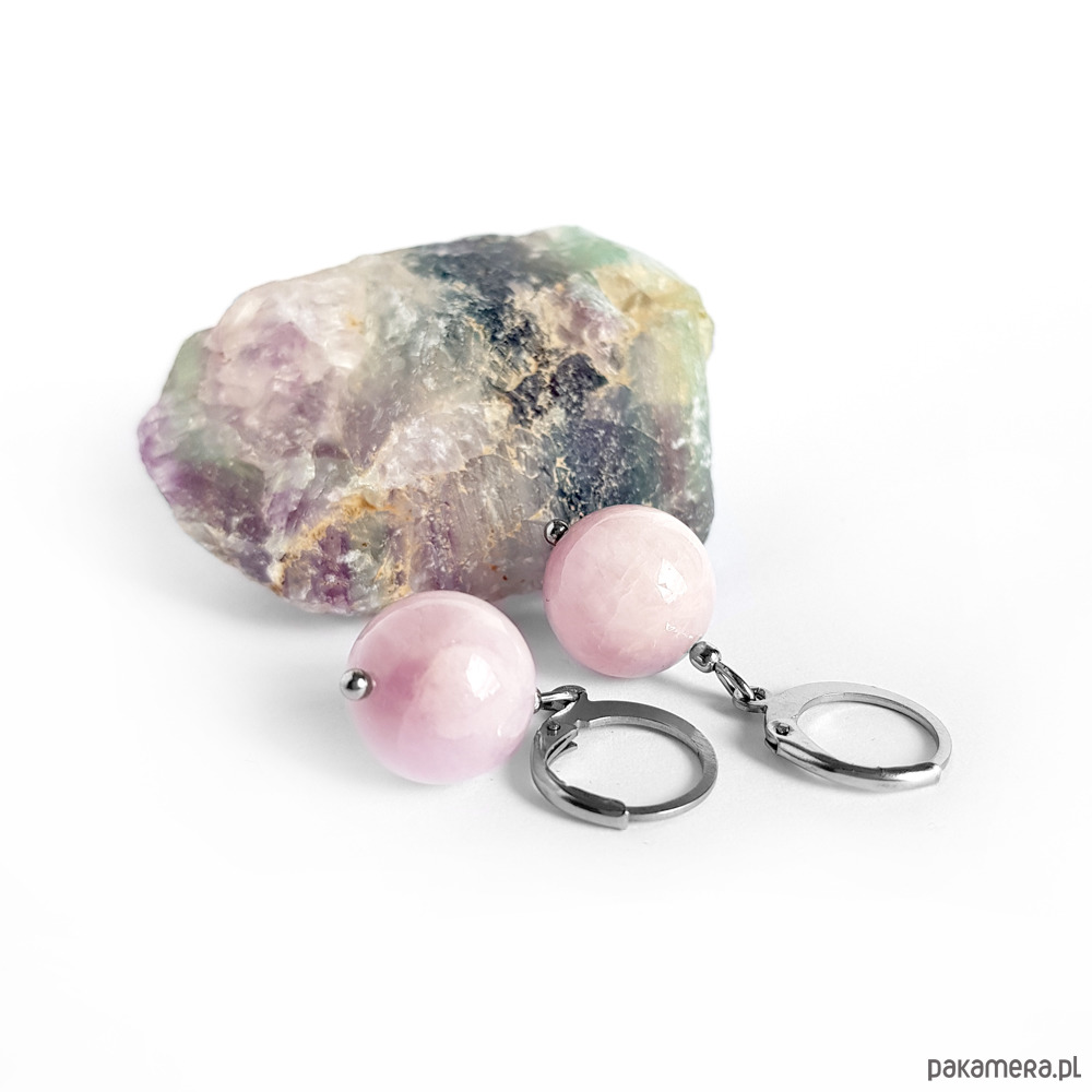 Kolczyki wykonane ręcznie z metalowych elementów ze stali chirurgicznej oraz 12 mm kul kunzytu.