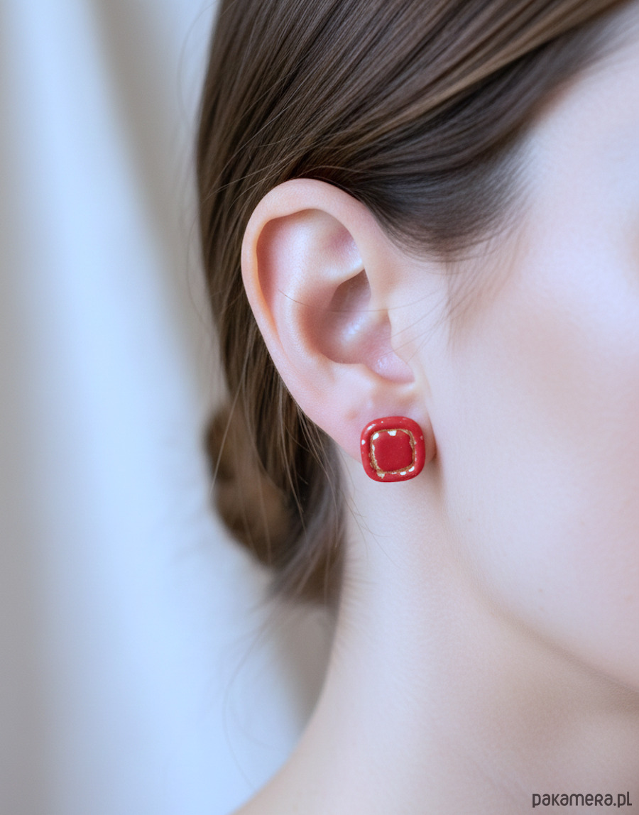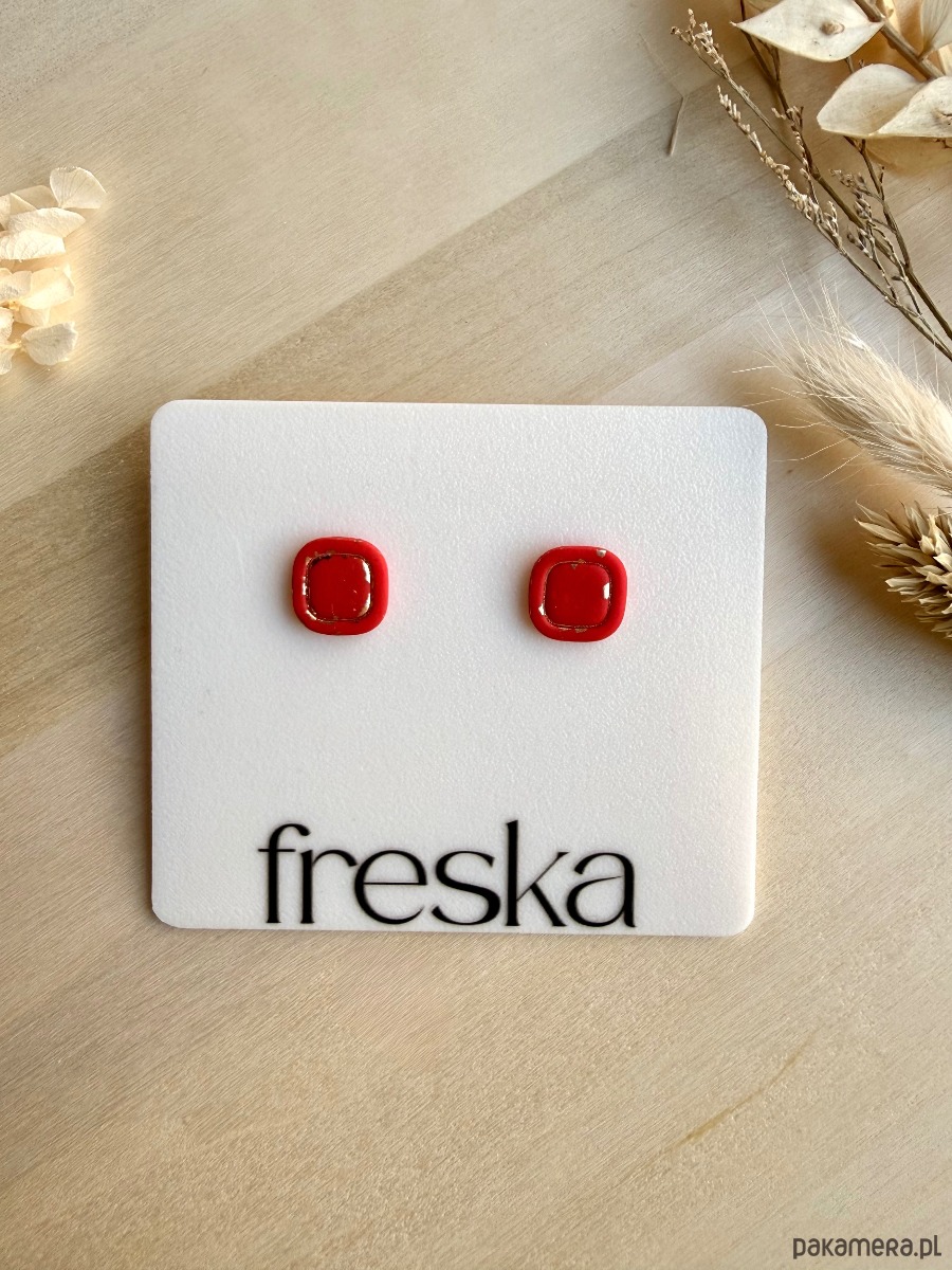 Kolczyki Kwadraty z Ramką czerwone ze złotym twistem