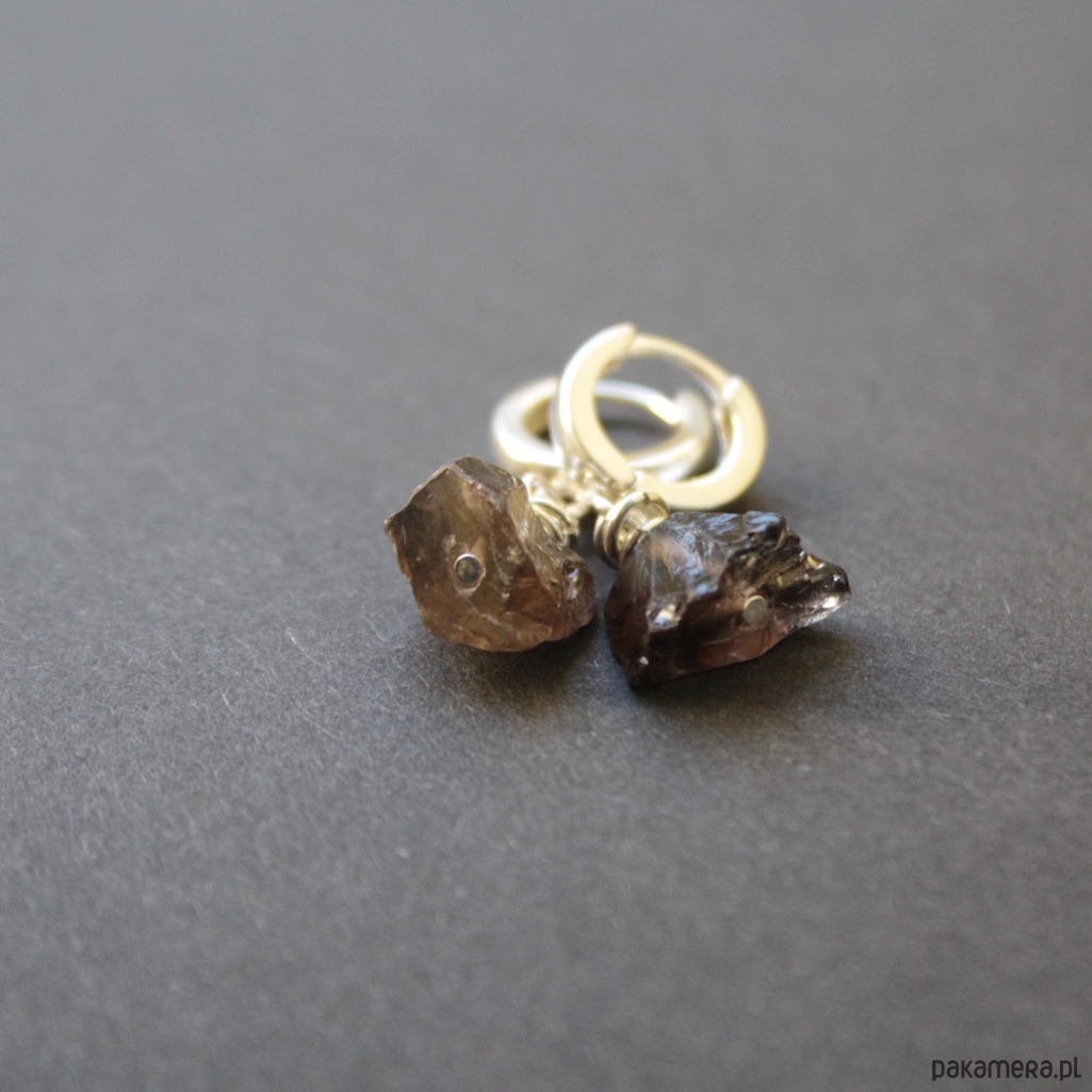 Kolczyki wykonane zostały ze srebra próby 925 oraz bryłek pięknego, surowego kwarcu dymnego wielkości 0,8 cm.
