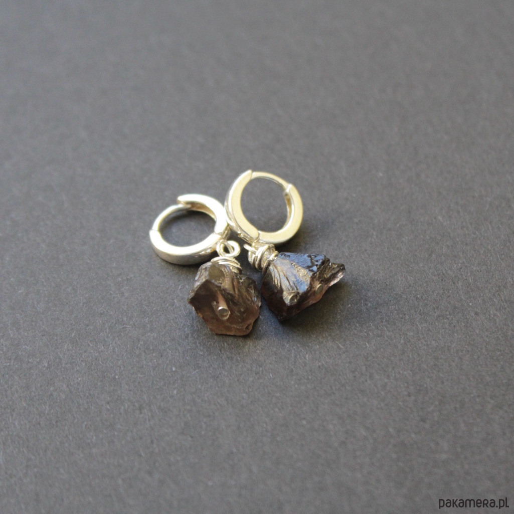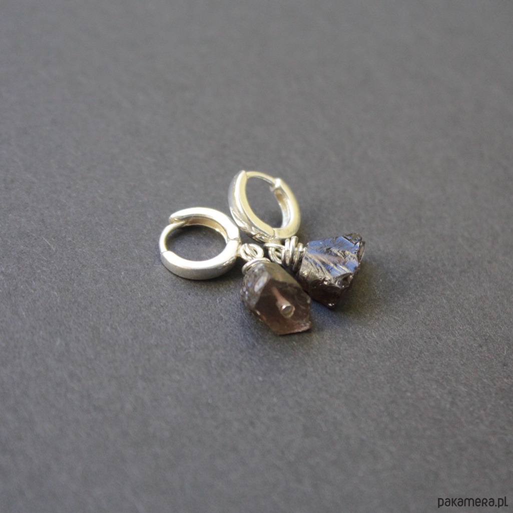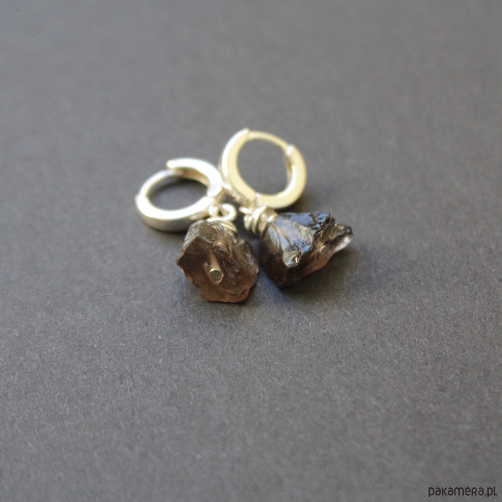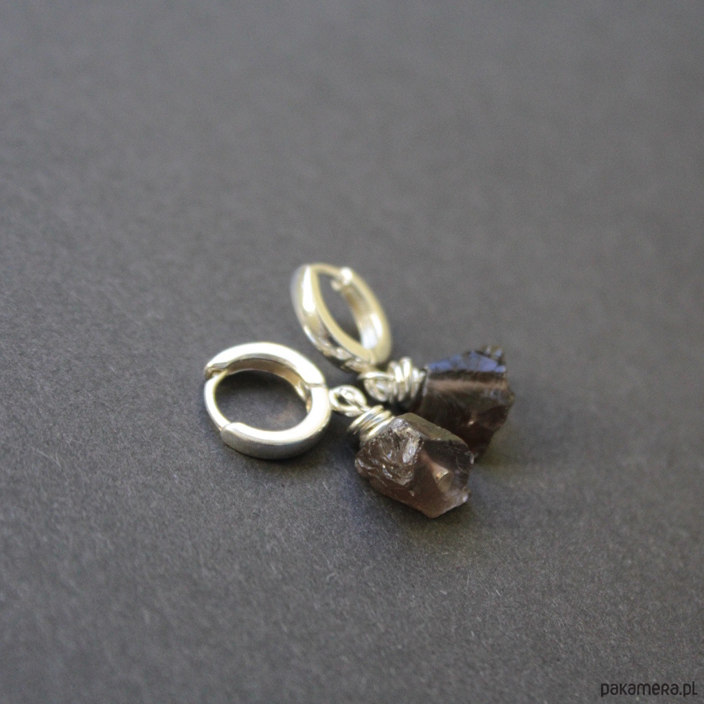 Kolczyki wykonane zostały ze srebra próby 925 oraz bryłek pięknego, surowego kwarcu dymnego wielkości 0,8 cm.