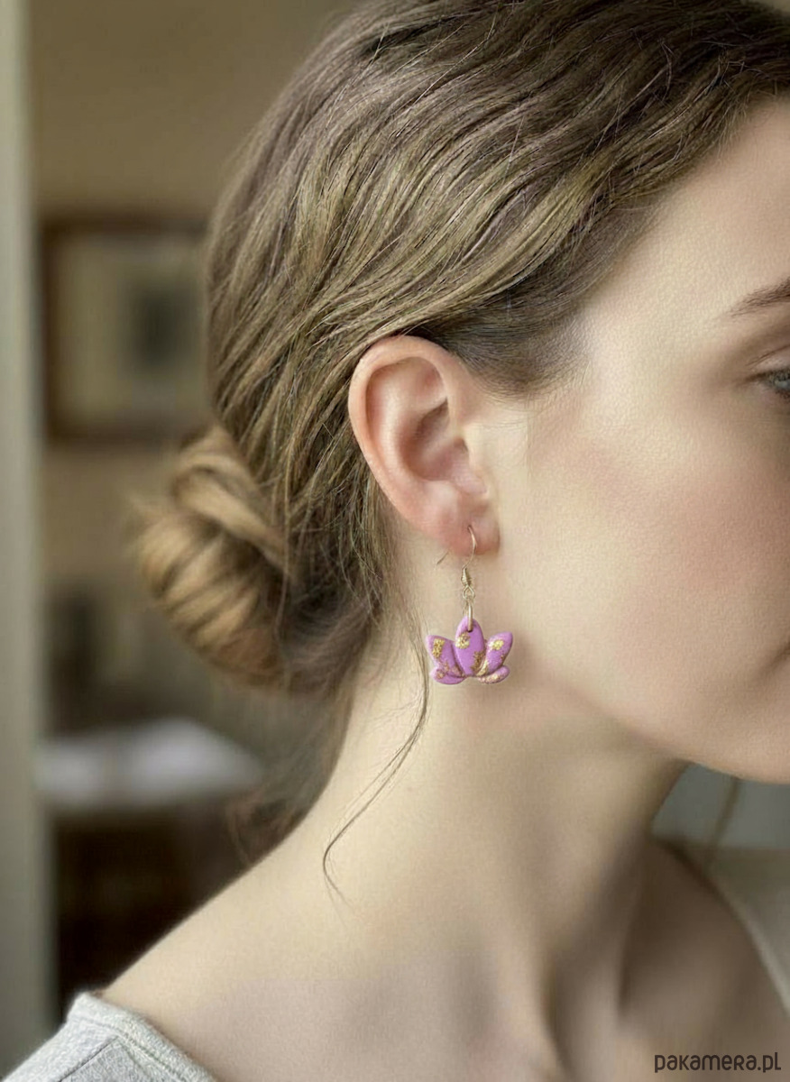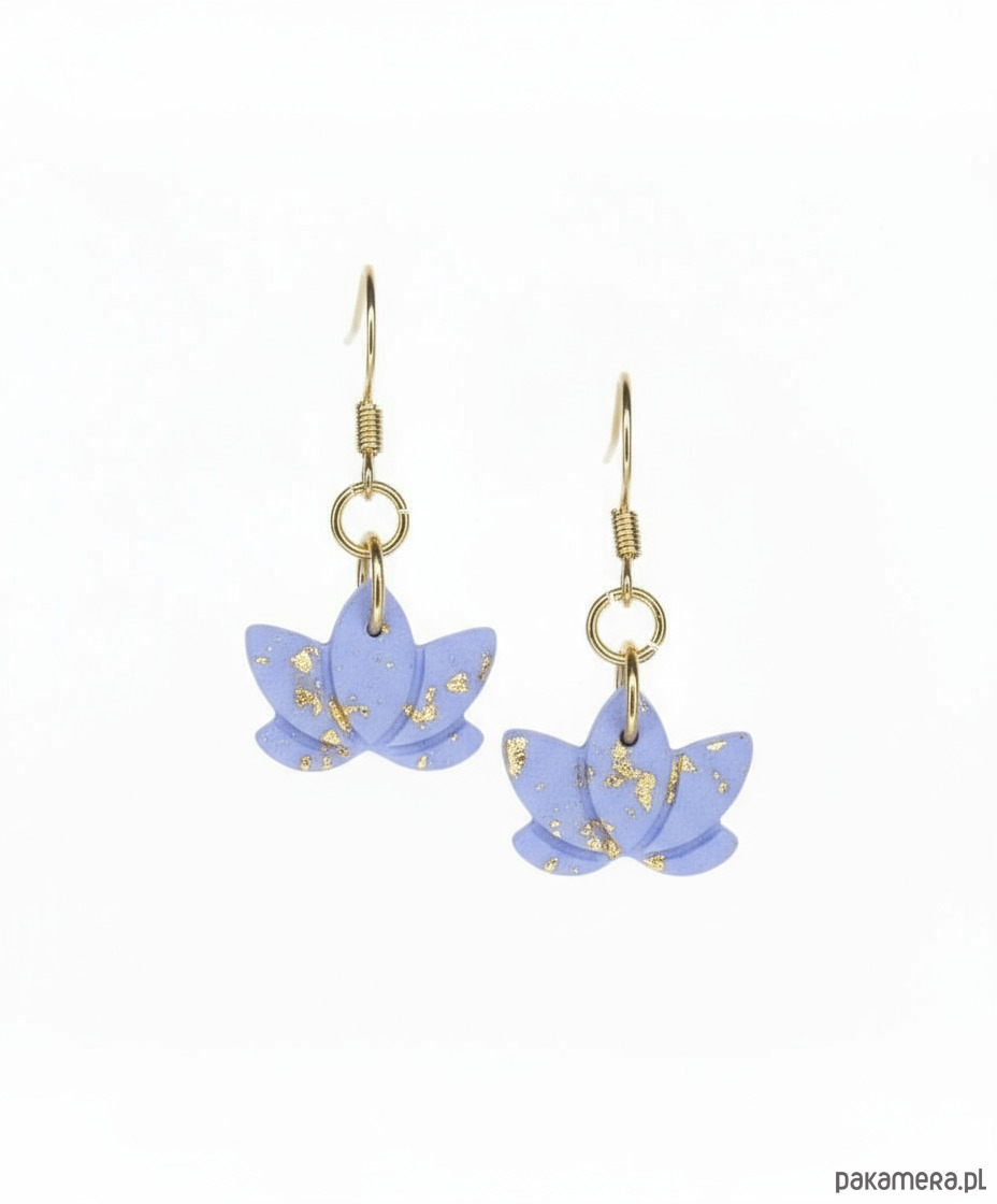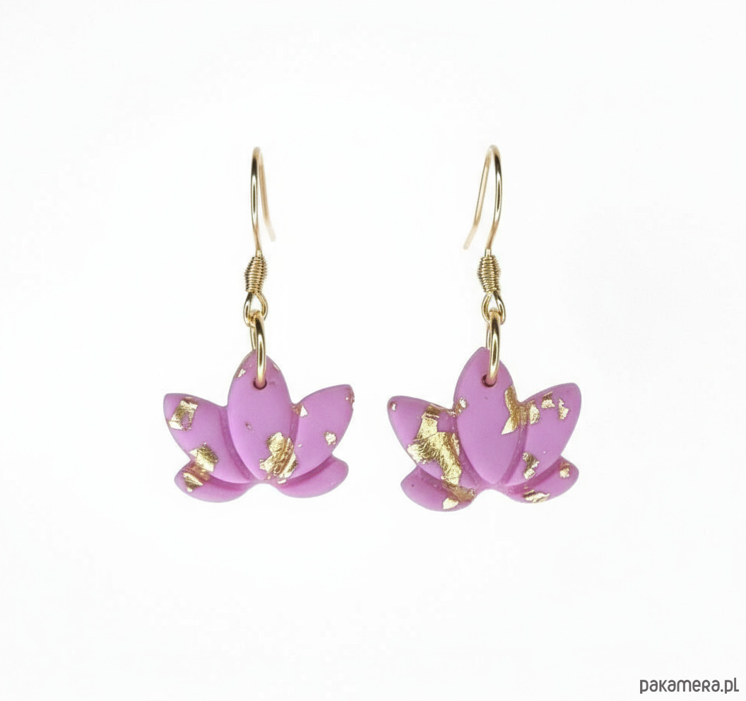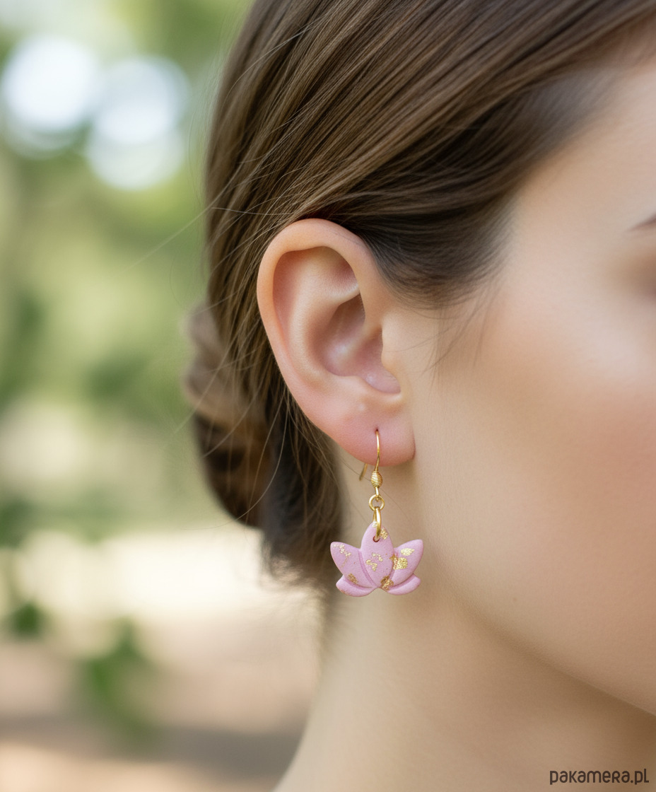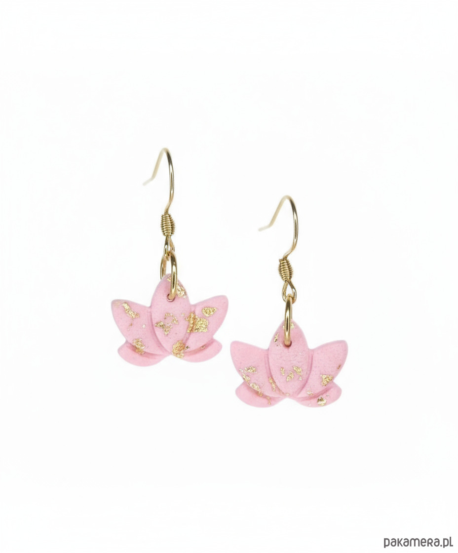 Delikatne, a jednocześnie przyciągające wzrok kolczyki w kształcie kwiatu lotosu. Wykonane z gliny polimerowej w trzech modnych odcieniach i ozdobione subtelnymi drobinkami złota, które dodają im lekkości i blasku.