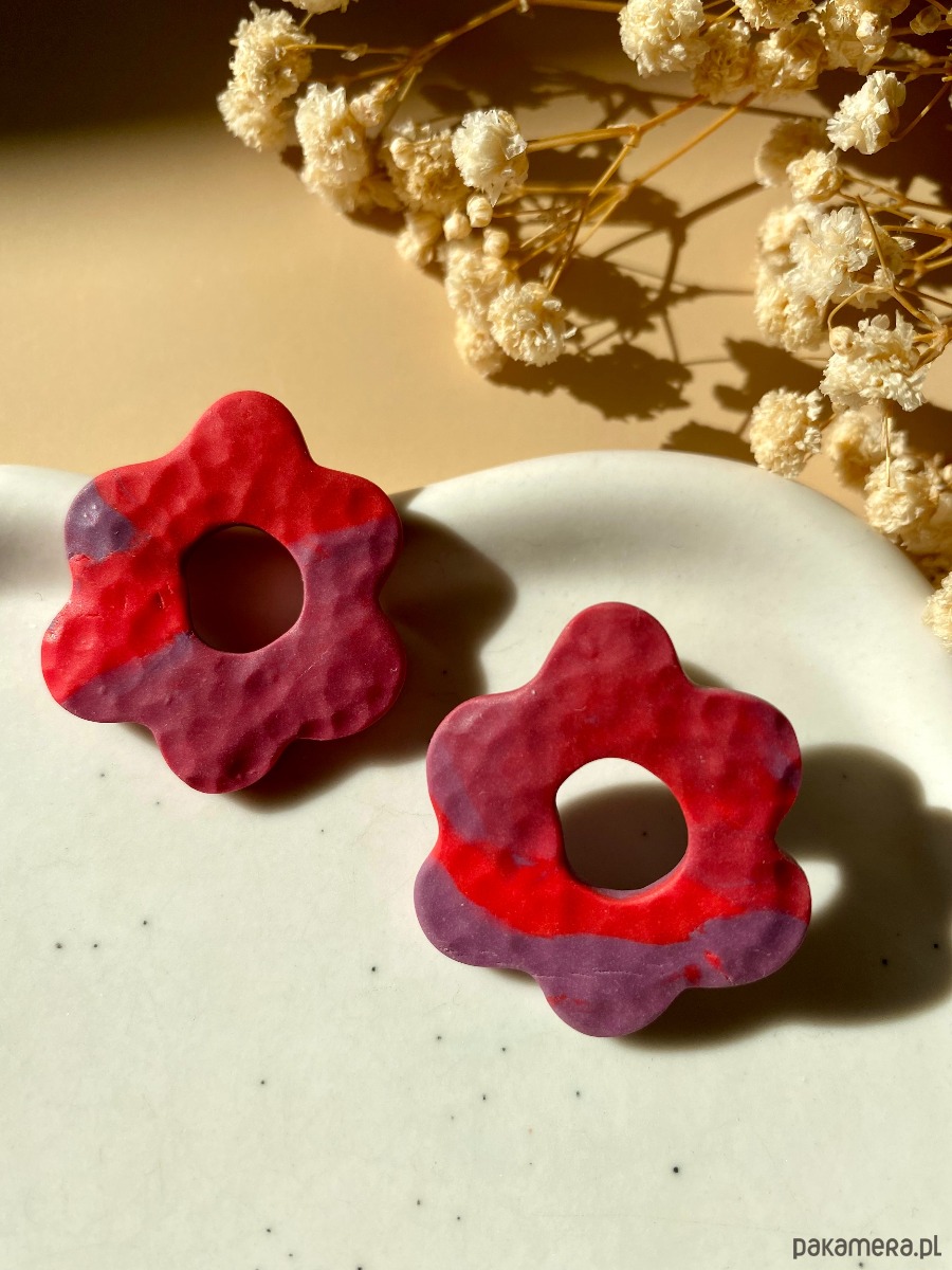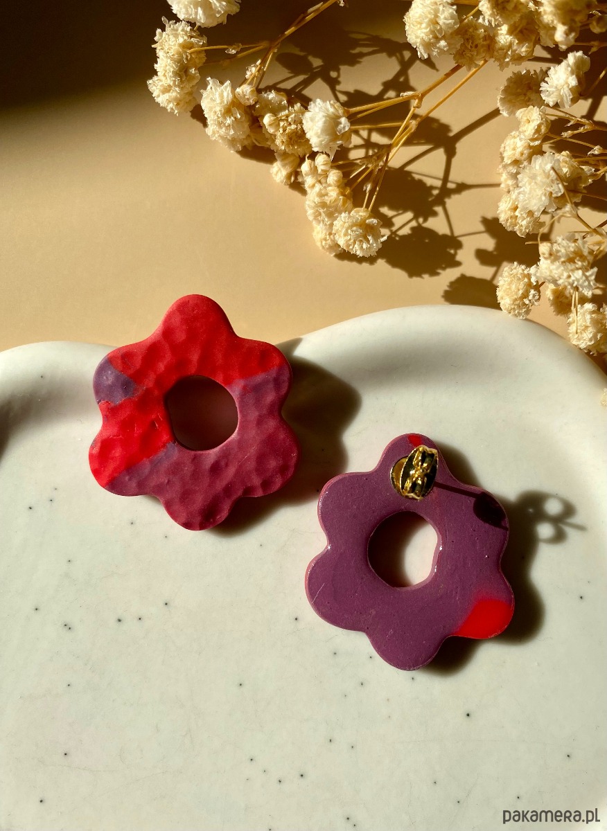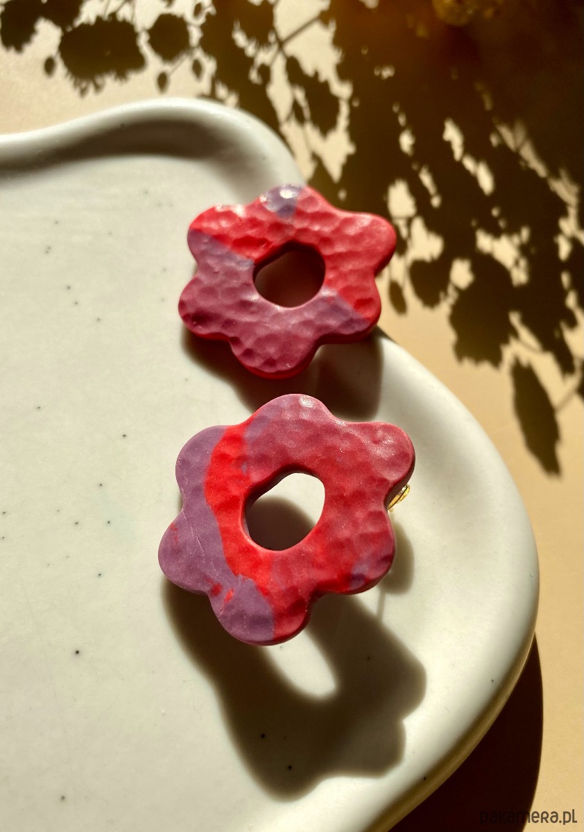 Kolczyki sztyfty w kształcie nieregularnego kwiatka. Matowe, z tyłu pokryte żywicą.
