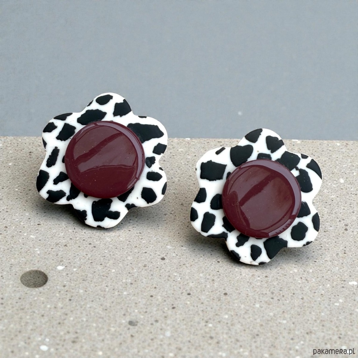 Oryginalne kolczyki wykonane ręcznie z dbałością o szczegóły z profesjonalnej glinki polimerowej, wypalane w piecu i szlifowane w domowej pracowni. Każda para kolczyków jest niepowtarzalna i wyjątkowa. Kolczyki są bardzo lekkie i wygodne, nie obciążają płatka ucha i przyciągają spojrzenia. Zapinane na sztyft ze stali chirurgicznej.