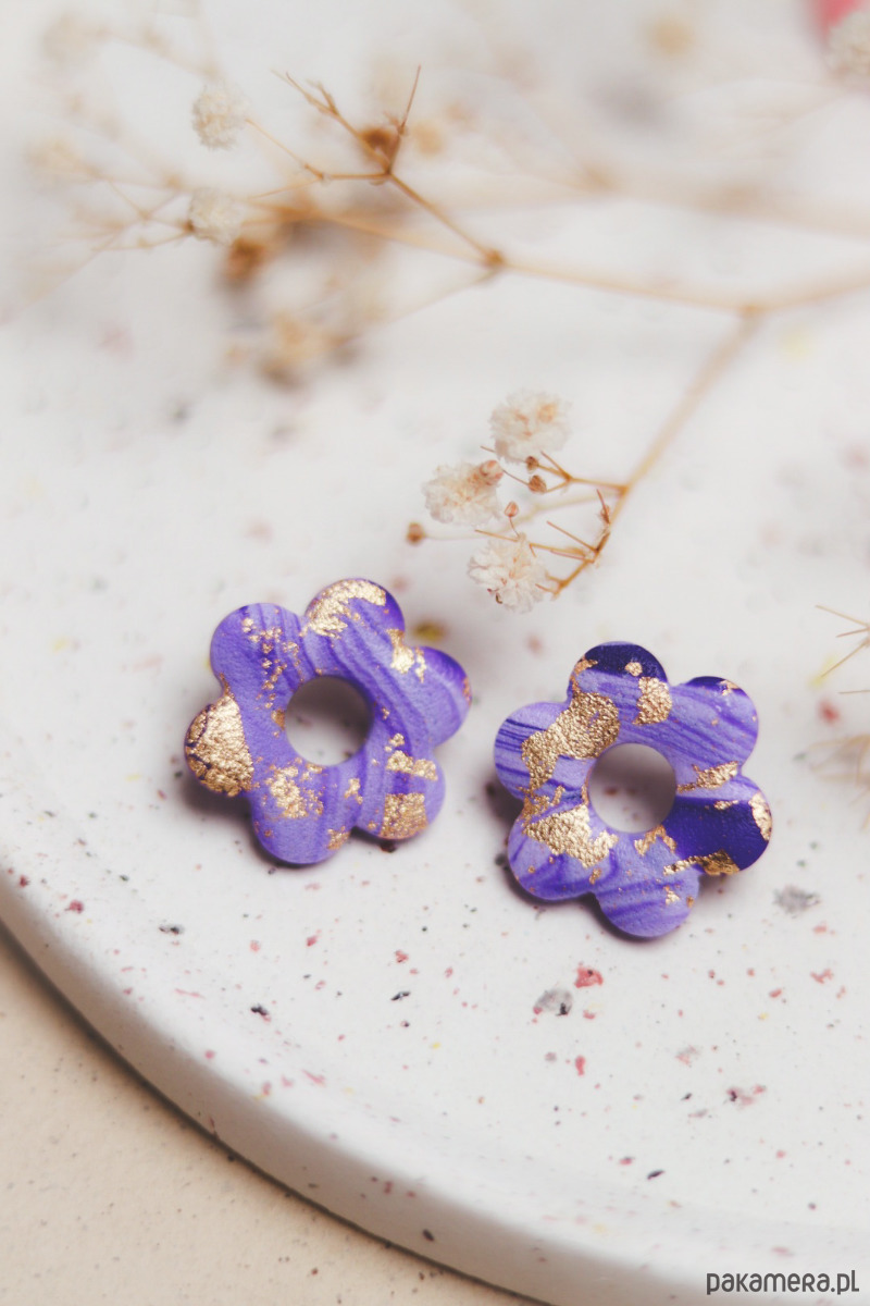 Ręcznie wykonane kolczyki w kształcie kwiatków w odcieniach fioletu, ozdobione złotym blaskiem.