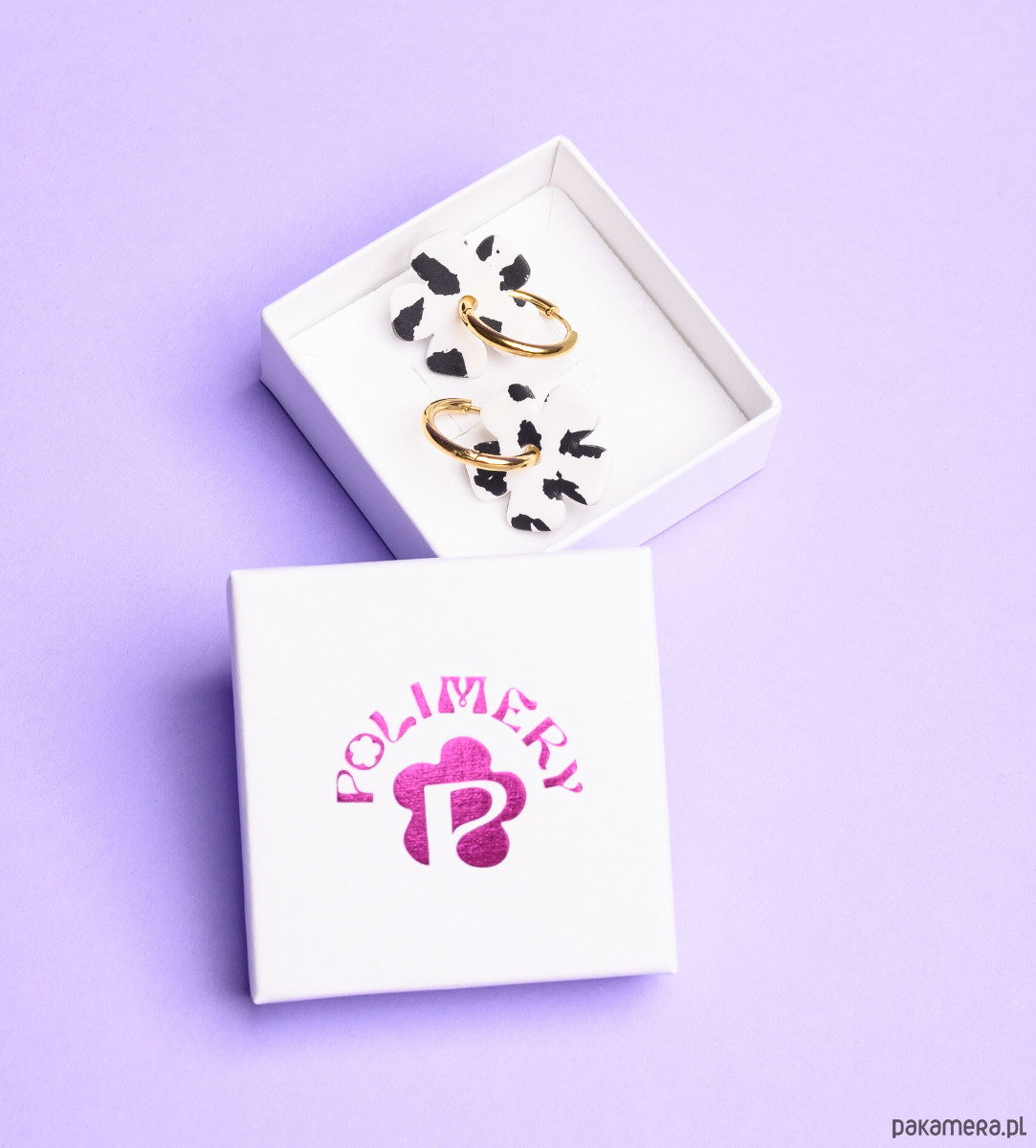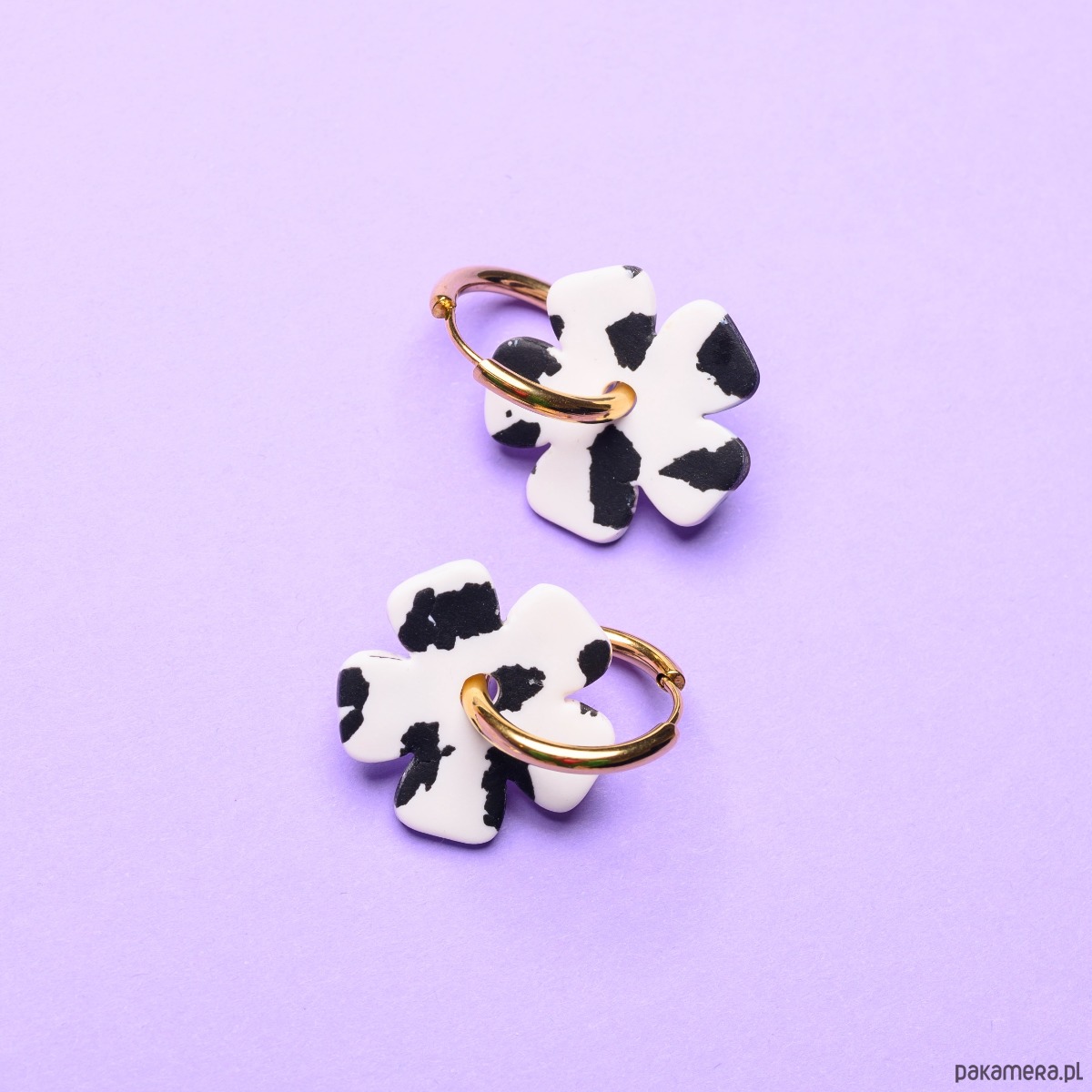 Kolczyki kwiatki we wzór krowich ciapek (robione ręcznie z gliny polimerowej)
