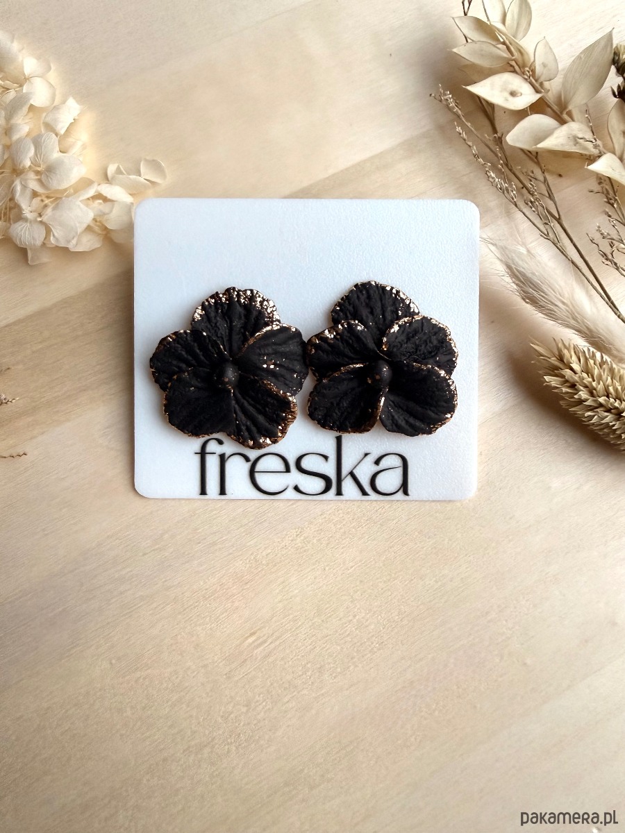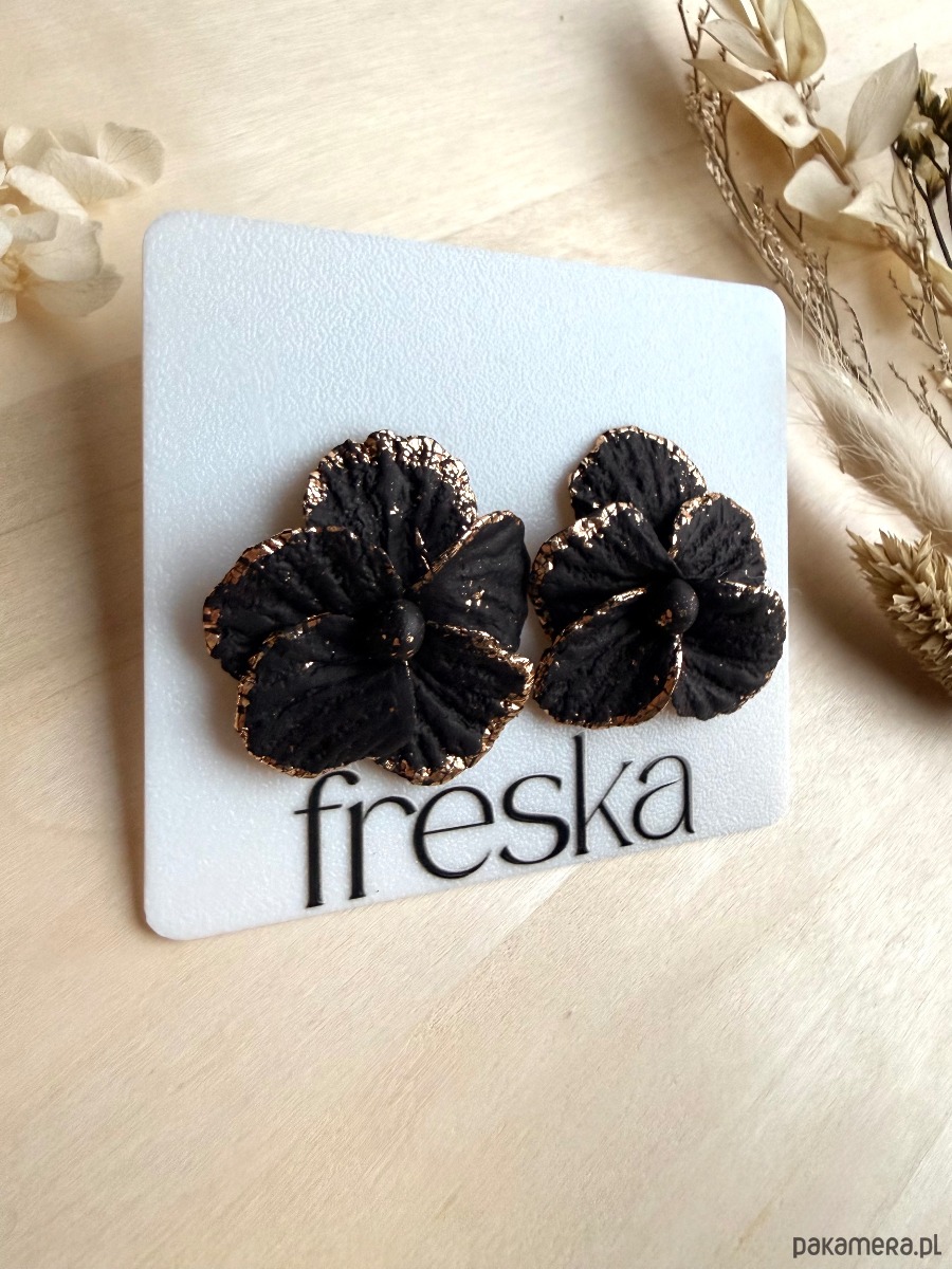 Dodaj swoim stylizacjom wyrafinowanego blasku z dużymi, ręcznie modelowanymi kolczykami–kwiatami w głębokiej czerni z eleganckim, złotym rantem! Starannie fakturowane płatki powstały z gliny polimerowej, a metalowe elementy wykonano ze stali chirurgicznej w złotym kolorze – odpowiedniej również dla osób z wrażliwą skórą.