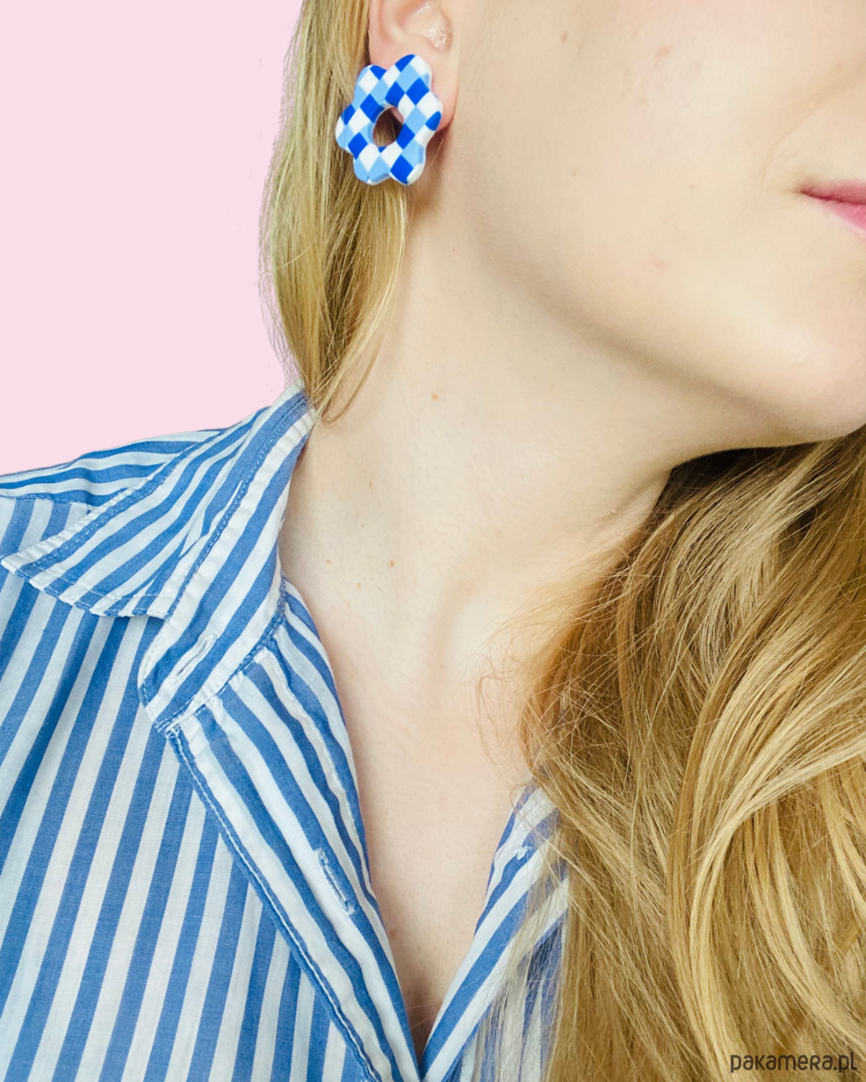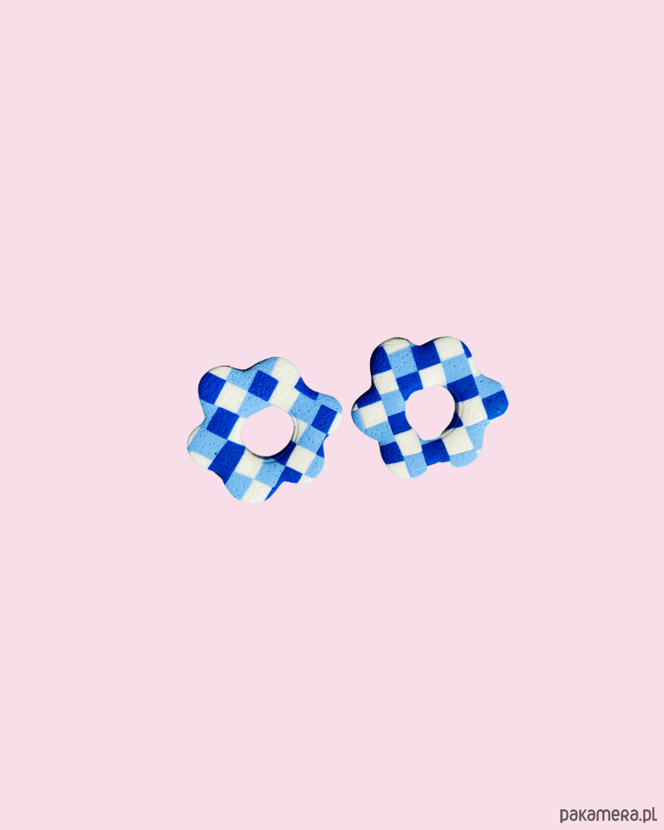 Niebieskie kolczyki kwiaty w kratkę - motyw szachownicy