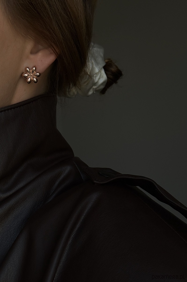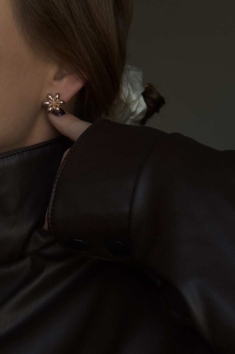 Złote kolczyki kwiaty. Całość wykonana ze srebra 925 powlekanego 18 karatowym różowym złotem. Zapinane na sztyft. Kolczyki posiadają zapięcia (baranki).