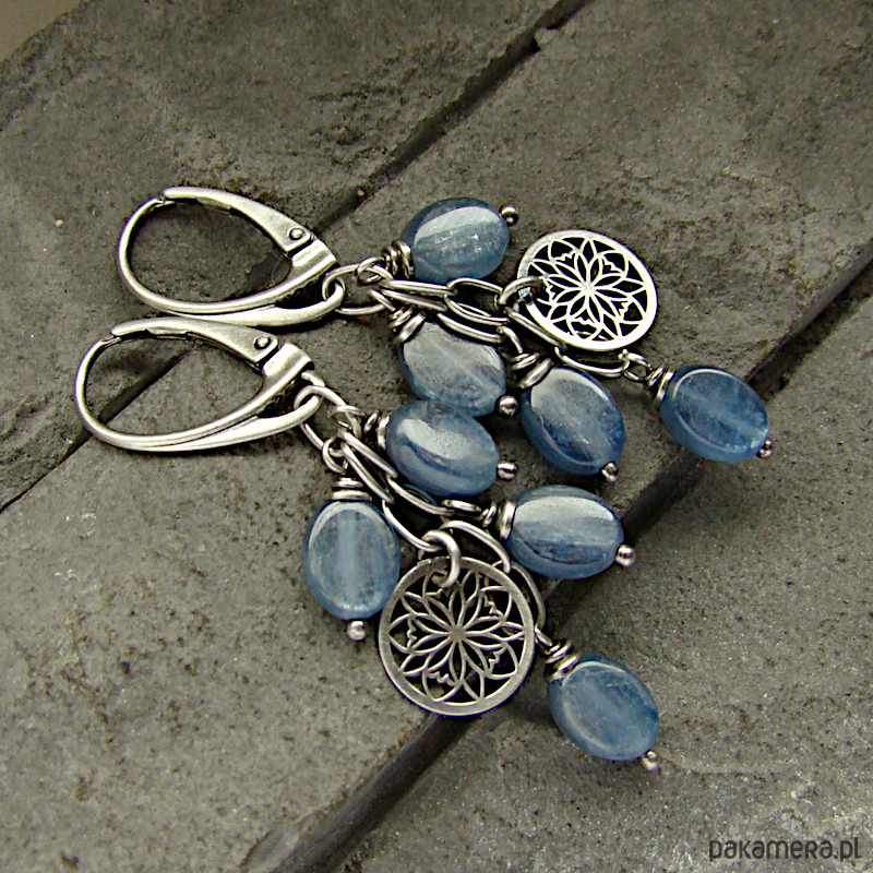 Subtelne, kobiece kolczyki, których główną ozdobą są piękne kamienie kyanitu. Wykonane w całości z oksydowanego srebra próby 925 oraz owali kyanitu wielkości ok. 0,8x0,6 cm. Srebrne rozetki są wielkości 1 cm. Całkowita długość kolczyków to 5 cm. Ozdobnie zapakowane.