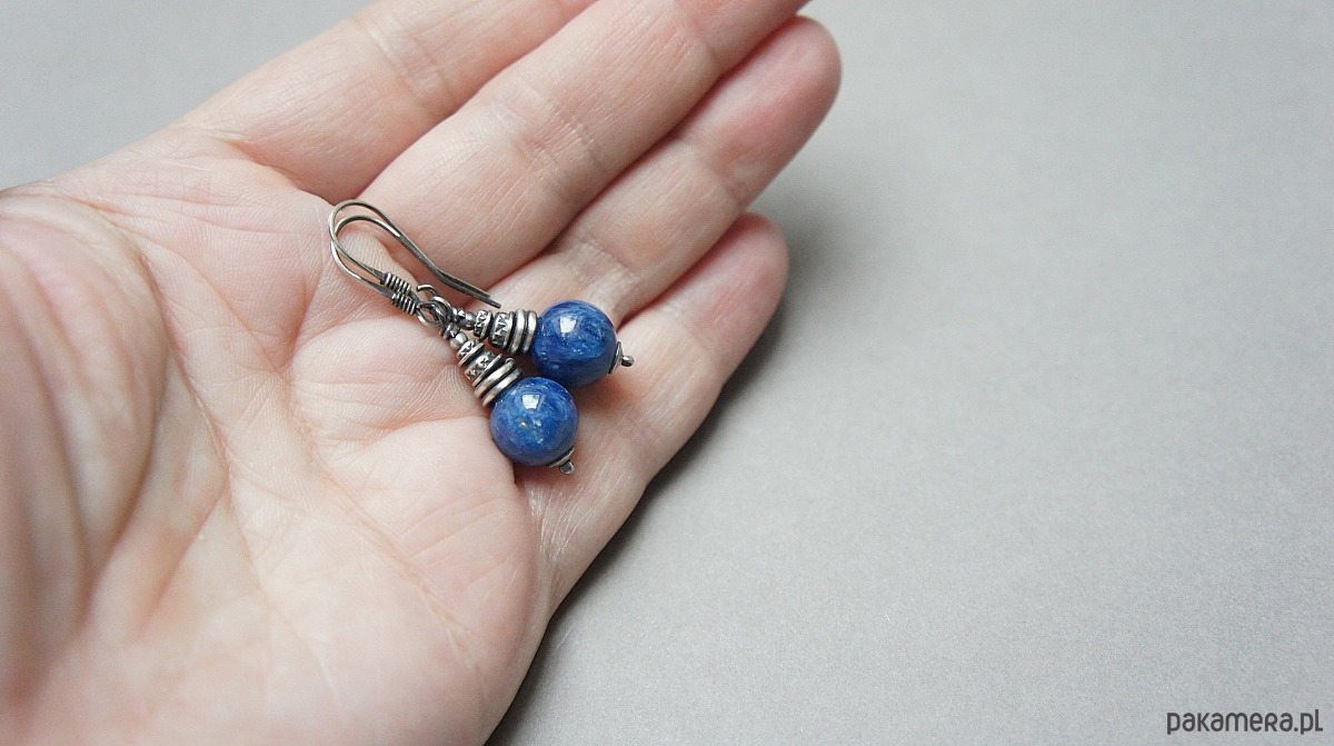 Kolczyki wykonane ze srebra [pr. 925] w połączeniu kuleczkami kyanitów [10mm]. Srebro oksydowane i przetarte. Całkowita długość kolczyków 4cm.