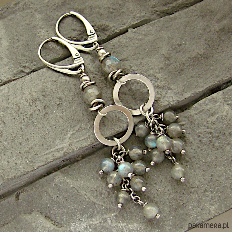 Kobiece i oryginalne kolczyki w formie gronek. Wykonane w całości z oksydowanego srebra próby 925 oraz fasetowanych kulek labradorytu wielkości 5,5 mm oraz gładkich kulek labradorytu wielkości 4,5 mm. Całkowita długość kolczyków to ok. 7,1 cm. Wielkosc srebrnych kol to 12,5 mm. Moge wykonac podobne kolczyki z innymi kamieniam. Ozdobnie zapakowane.