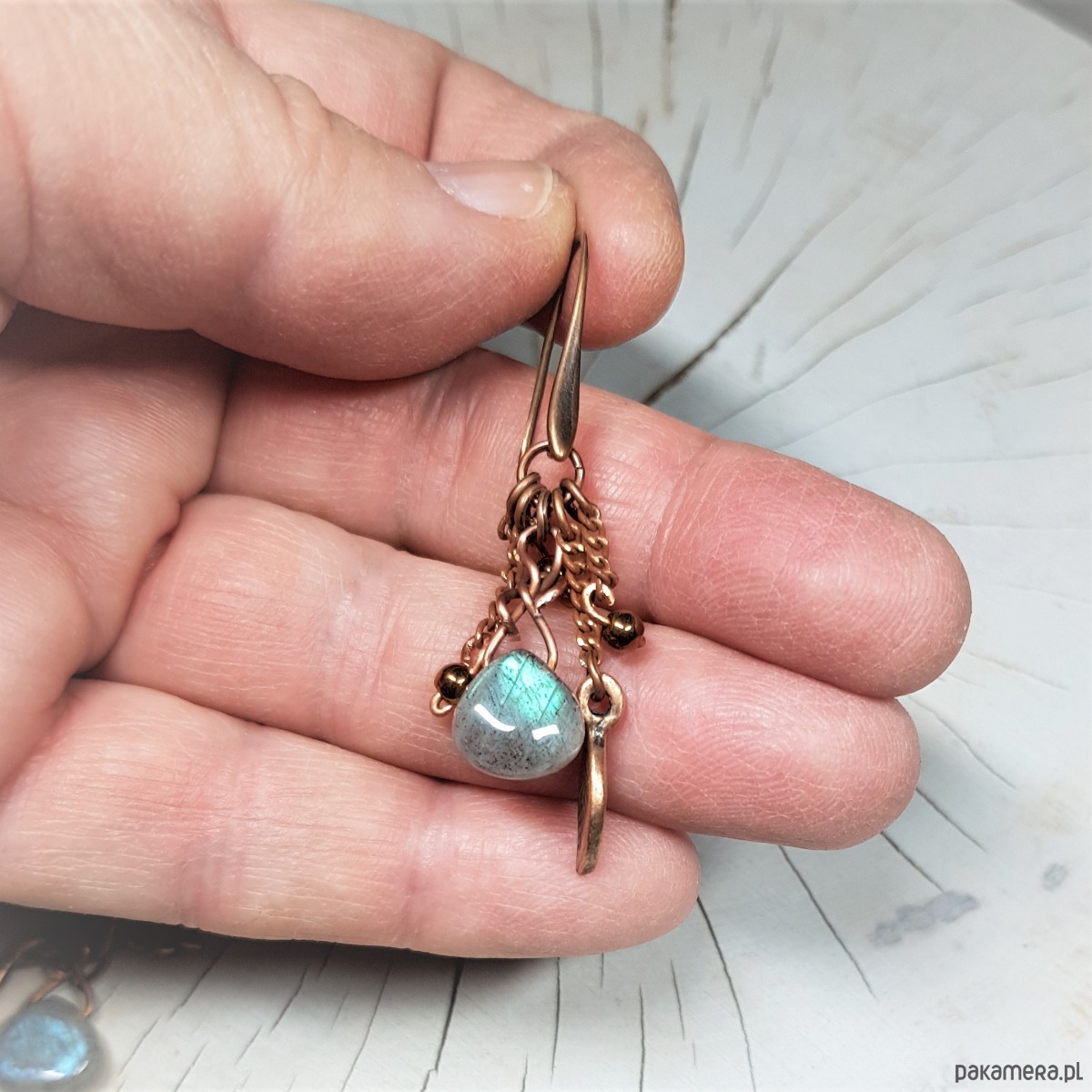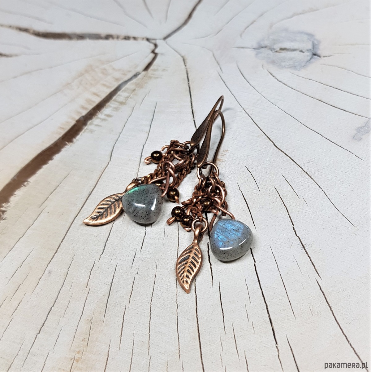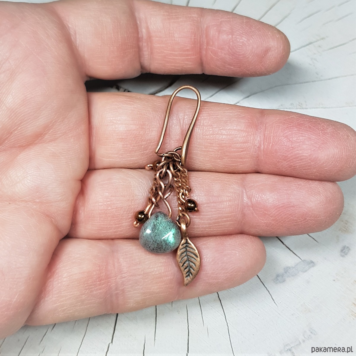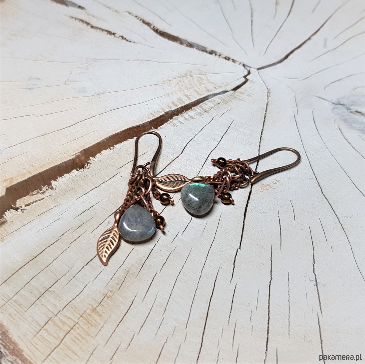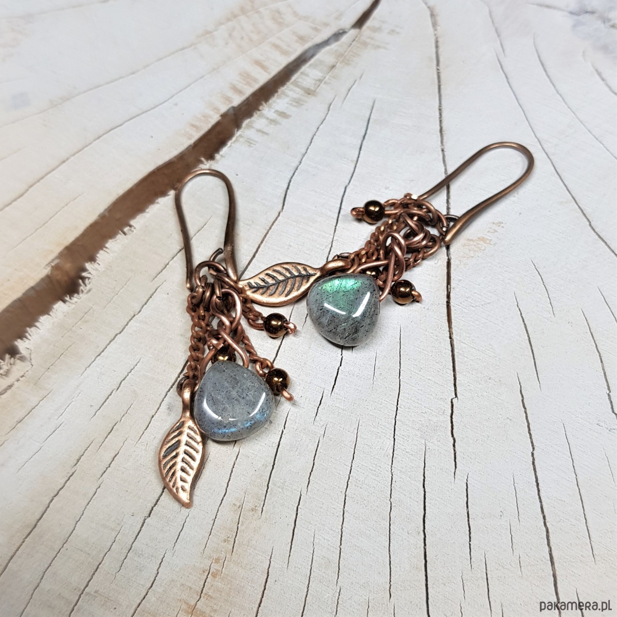 Kolczyki wykonane ręcznie w miedzi techniką wire-wrappingu. Ozdobą kolczyków są krople labradorytu i miedziane listki. Długość kolczyków 51 mm