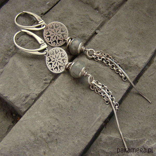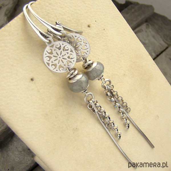 Kobiece, subtelne i oryginalne kolczyki na co dzień i nie tylko. Wykonane w całości z oksydowanego srebra próby 925 oraz fasetowanych oponek labradorytu wielkości 0,8 cm. Zapięcia zamykane angielskie.. Całkowita długość kolczyków to ok. 8,4 cm. Długie, lekkie i zwiewne. Ozdobnie zapakowane.