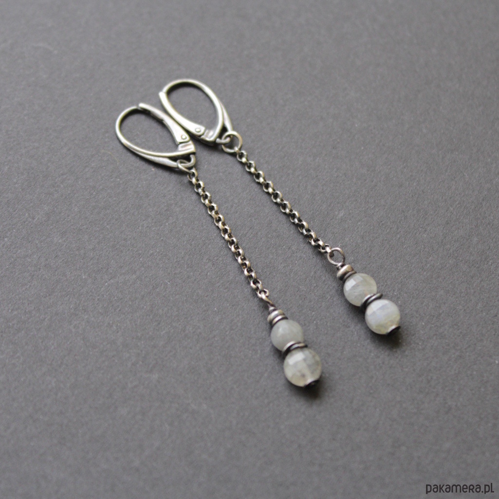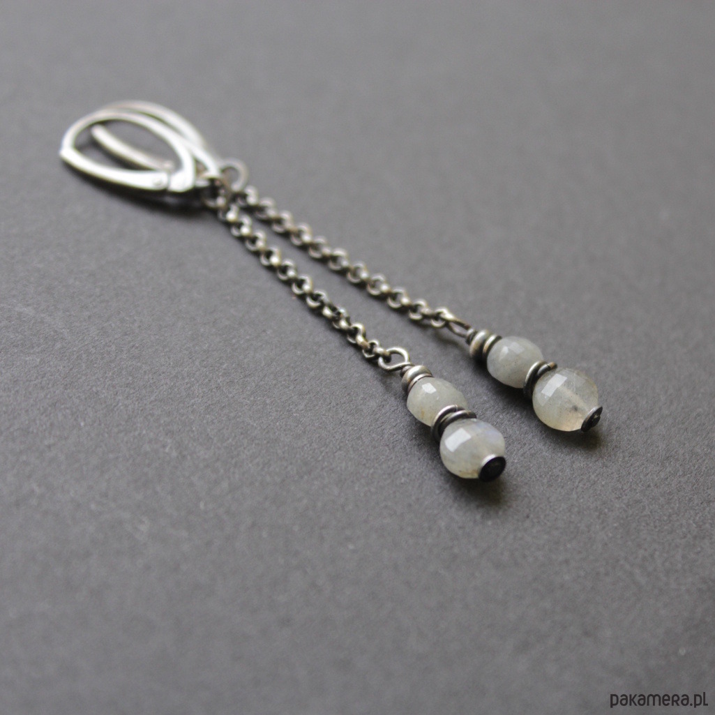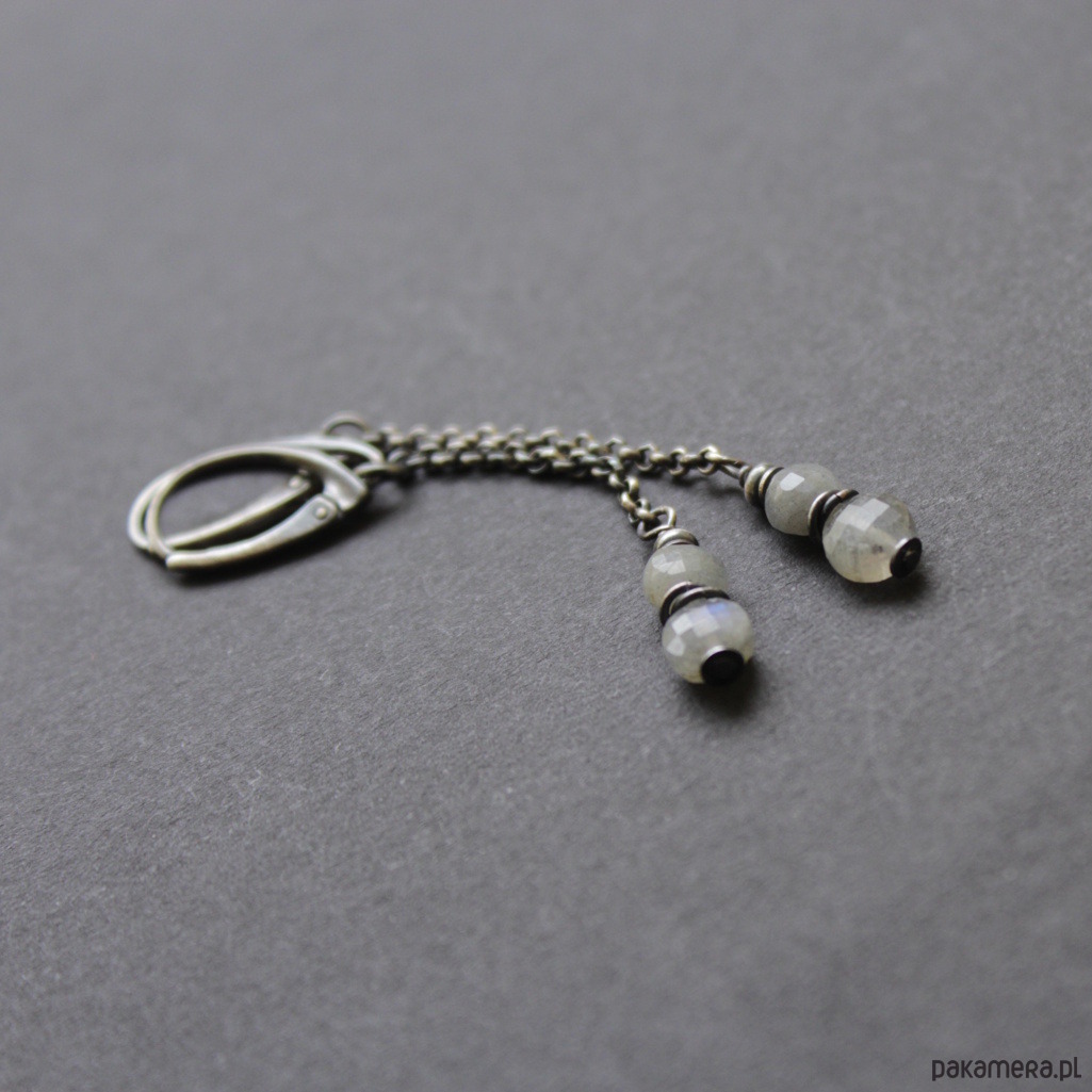 Długie kolczyki wykonane zostały z oksydowanego srebra próby 925 oraz pięknych labradorytów wielkości 0,5 cm.