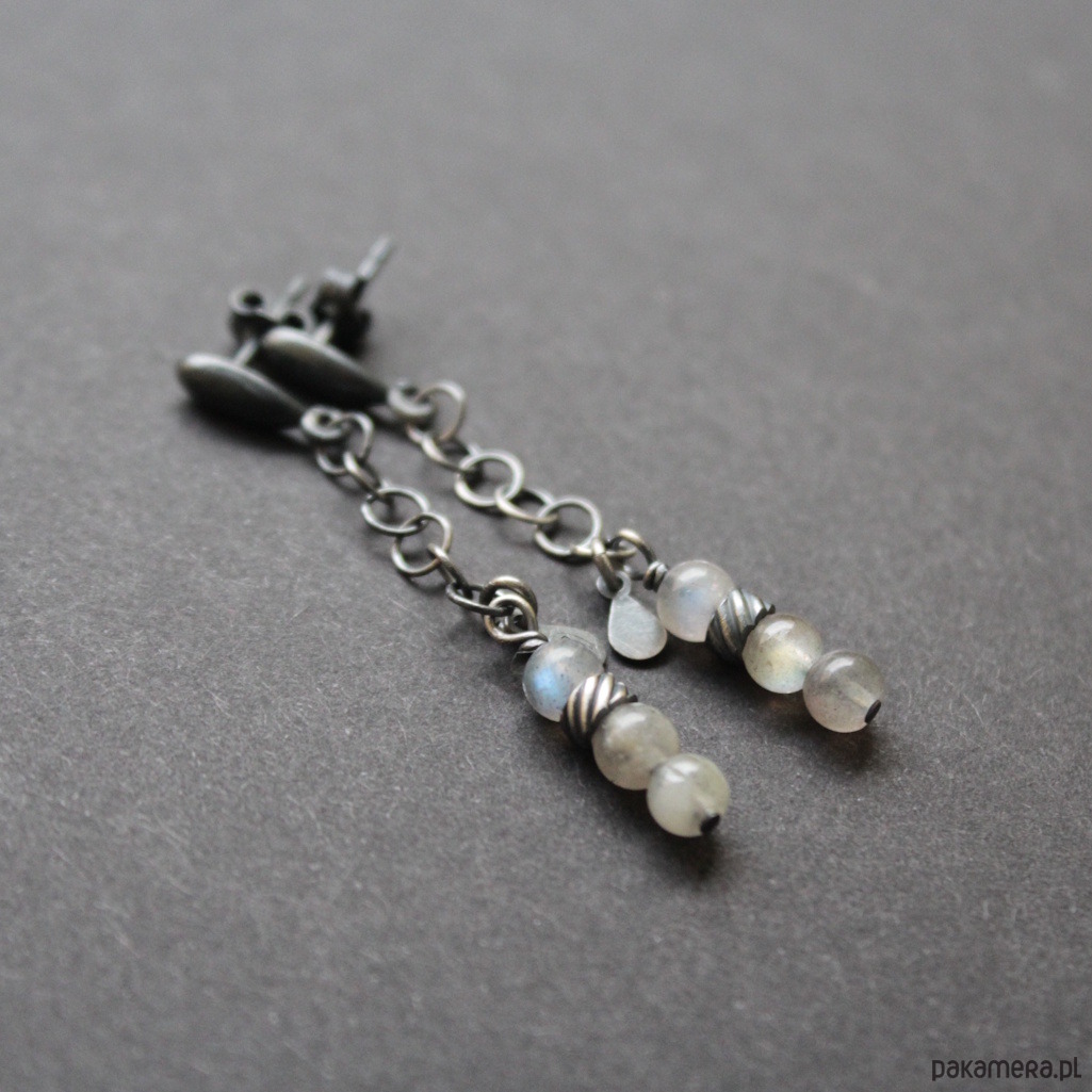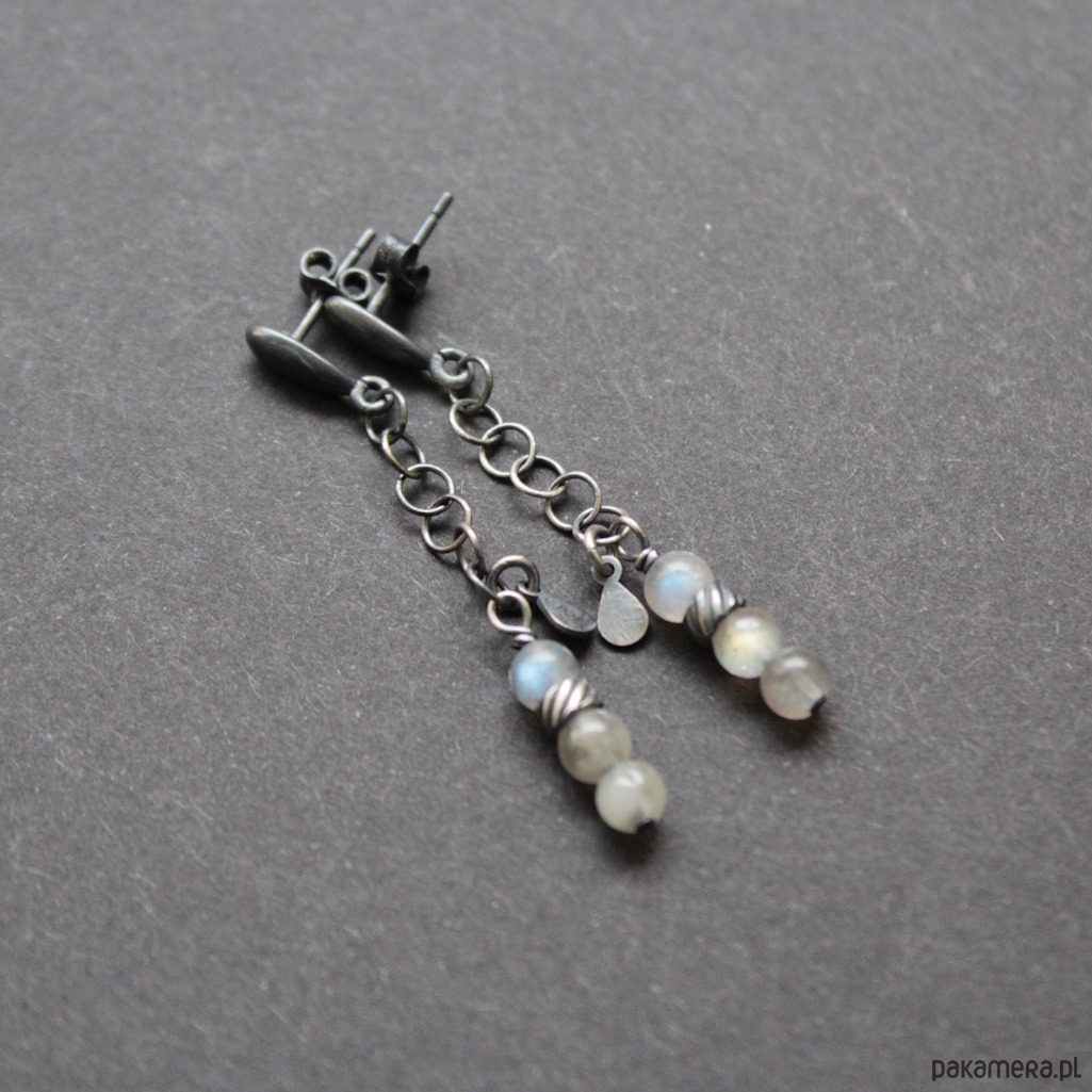Kolczyki wykonane zostały z oksydowanego srebra próby 925 oraz pięknych labradorytów wielkości 0,4 cm.