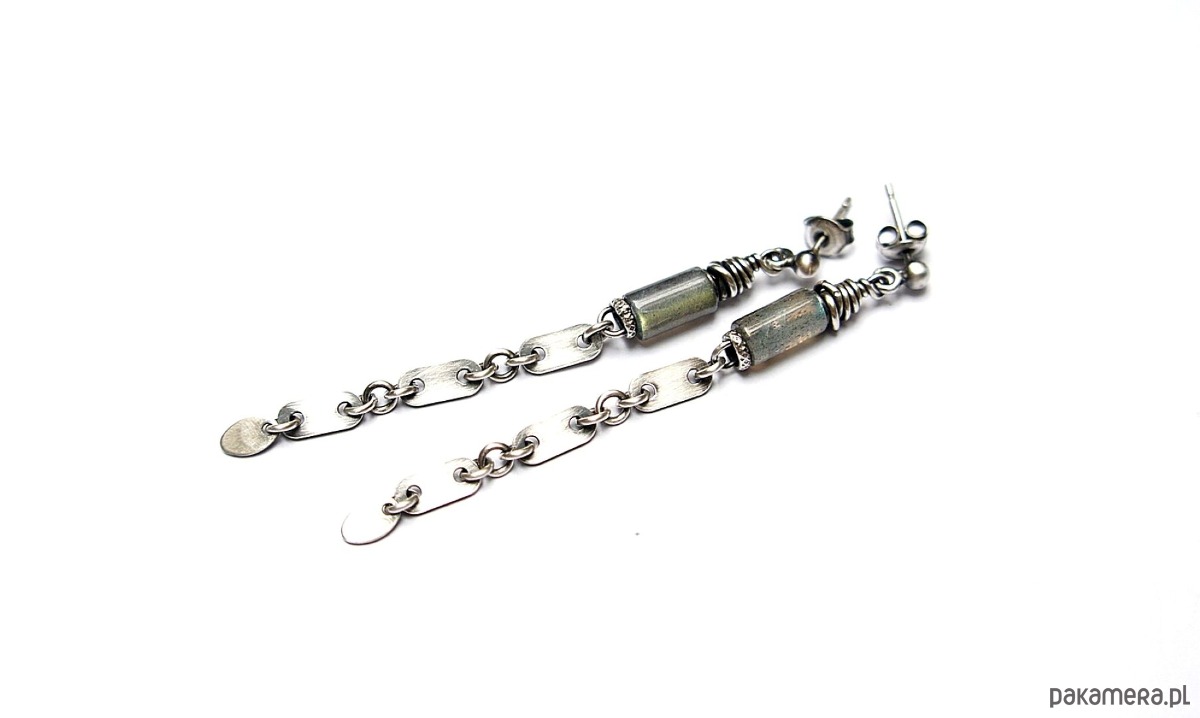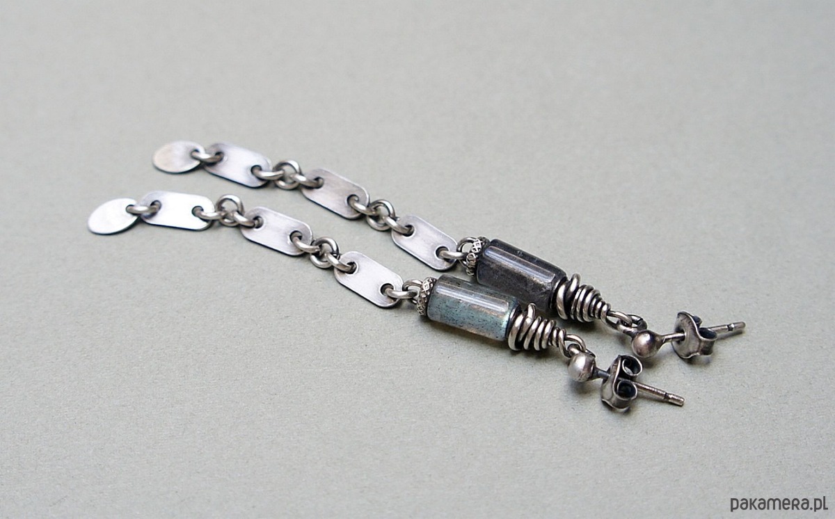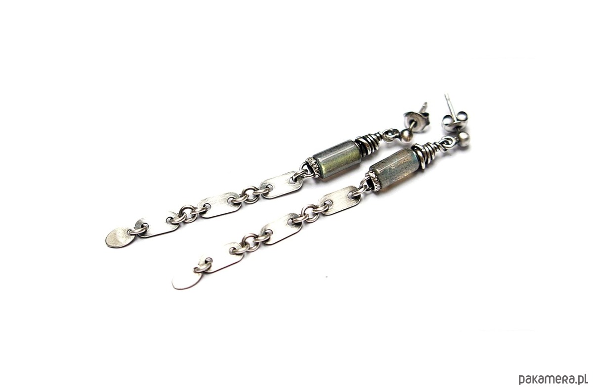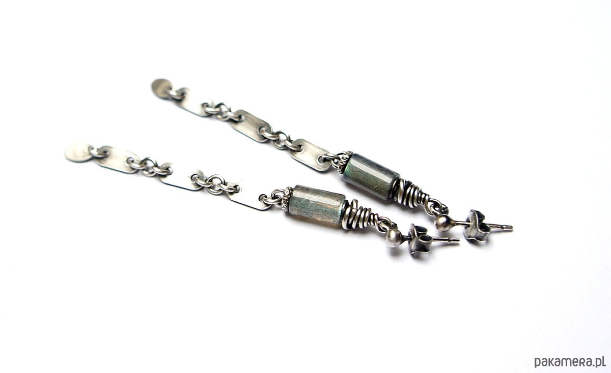 Kolczyki wykonane ze srebra [pr.925] w połączeniu z naturalnymi kamieniemia - wałeczkami labradorytów [8mm]. Srebro zaoksydowane i przetarte. Całkowita długość kolczyków 6,9cm. Biżuteria ozdobnie zapakowana.