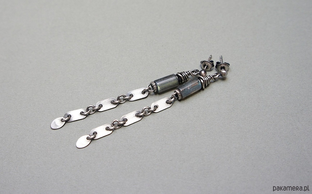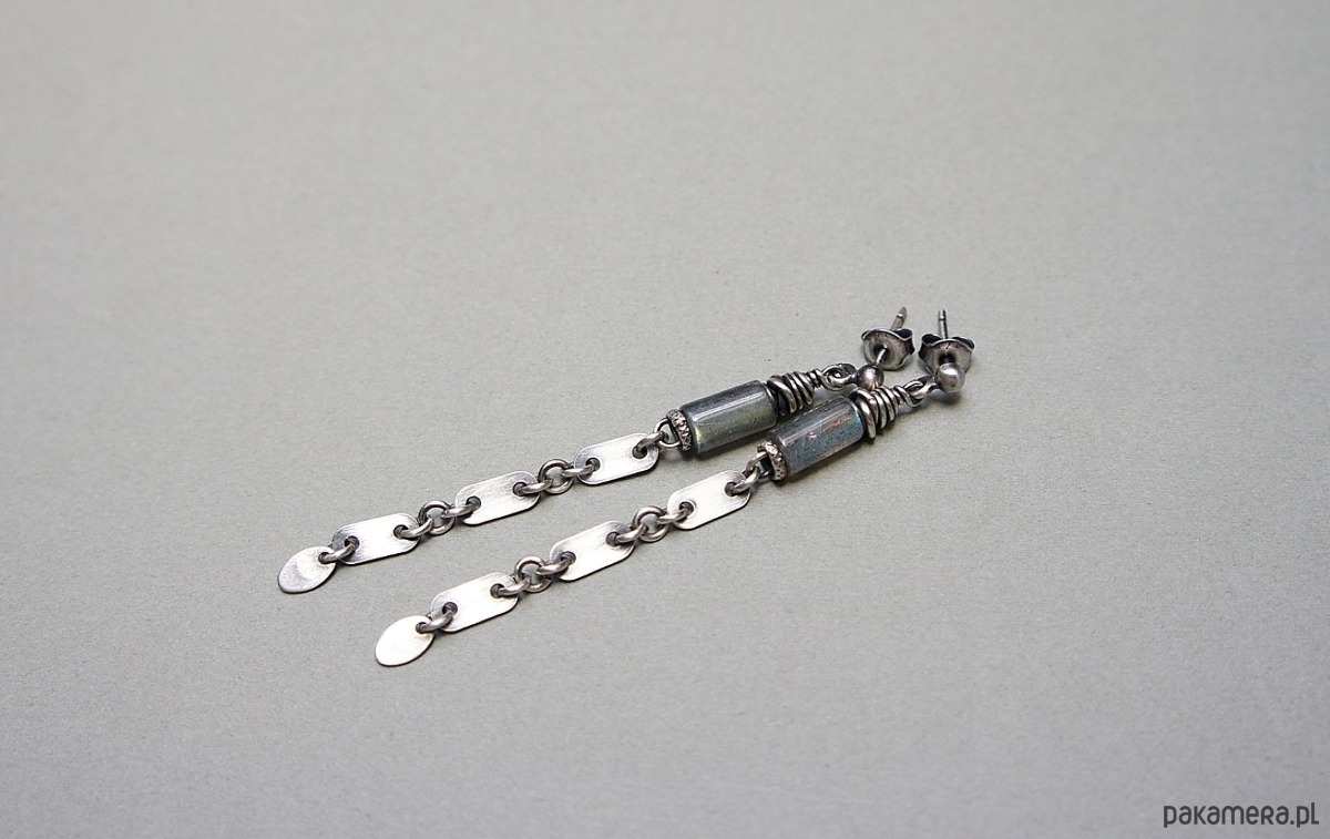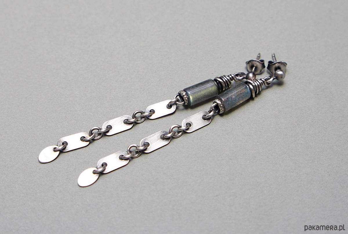 Kolczyki wykonane ze srebra [pr.925] w połączeniu z naturalnymi kamieniemia - wałeczkami labradorytów [8mm]. Srebro zaoksydowane i przetarte. Całkowita długość kolczyków 6,9cm. Biżuteria ozdobnie zapakowana.