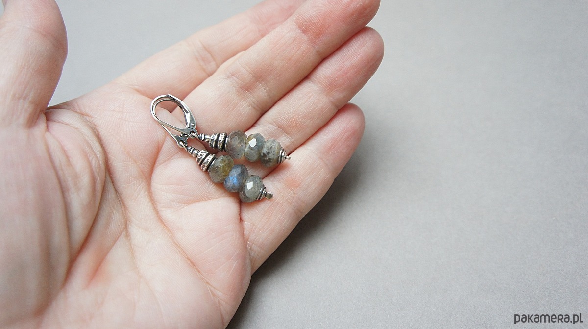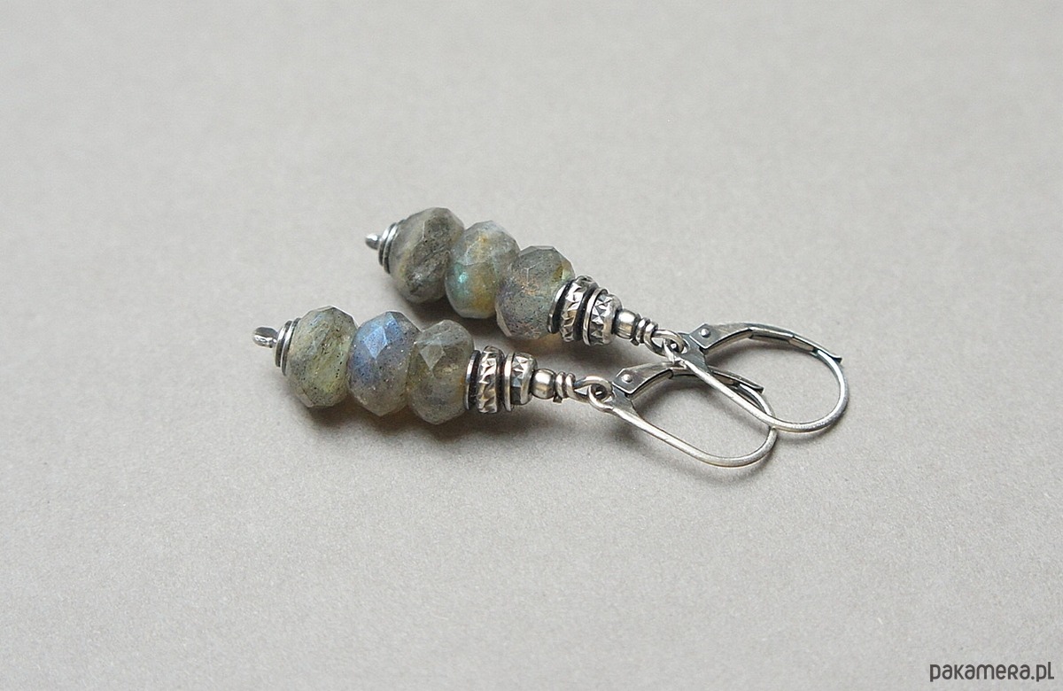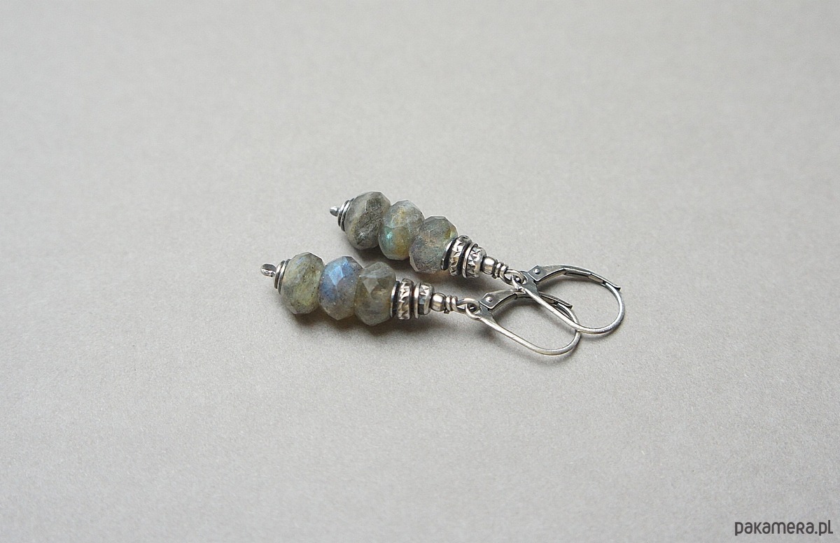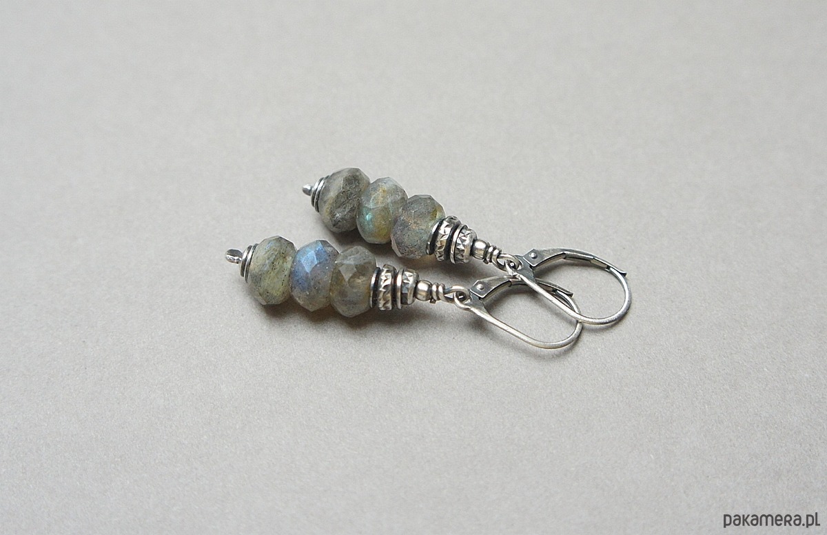 Kolczyki wykonane ze srebra [pr.925] w połączeniu z fasetowanymi oponkami labradorytów [9mm]. Całość oksydowana i przetarta. Całkowita długość kolczyków 4,7cm. Biżuteria ozdobnie zapakowana.