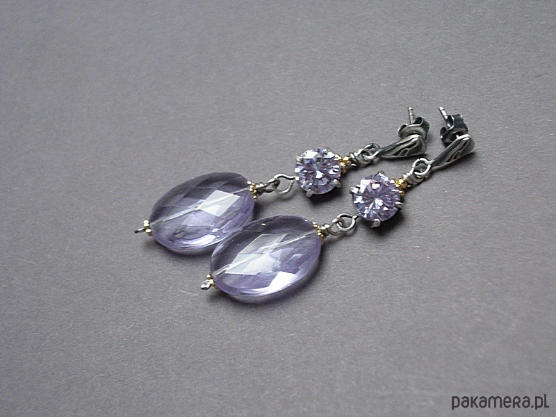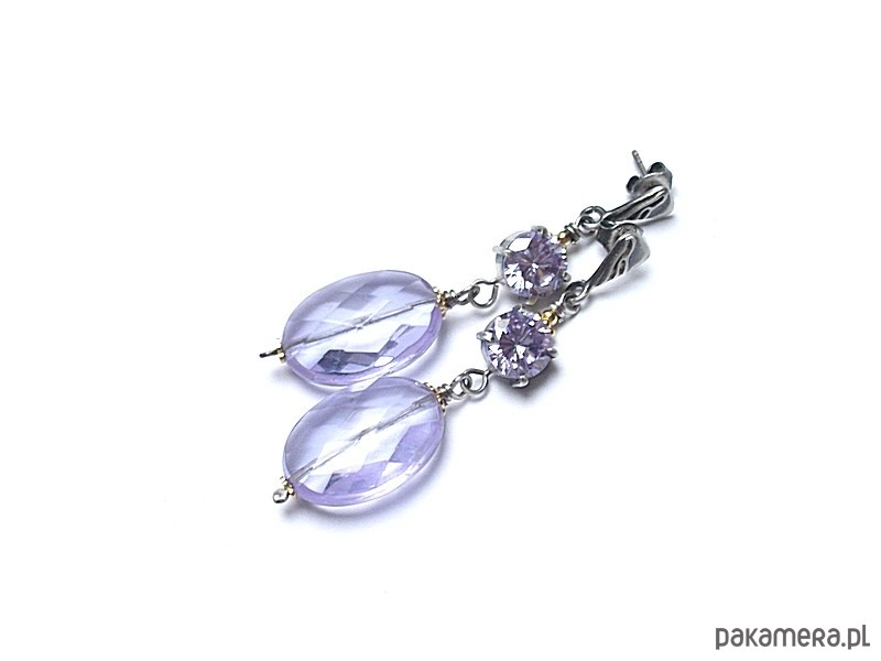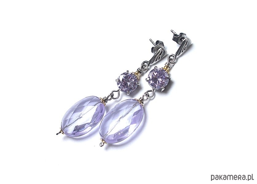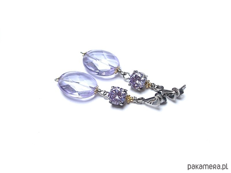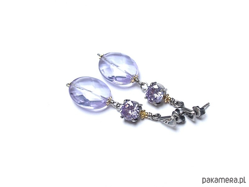 Kolczyki wykonane ze srebra i srebra pokrytego 24k złotem [pr. 925] w połączeniu z fasetowanymi pastylkami kwarców [20mm] oraz lawendowymi cyrkoniami [8mm]. Srebro częściowo oksydowane i przetarte. Całkowita długość kolczyków 5,8cm. Biżuteria ozdobnie zapakowana.