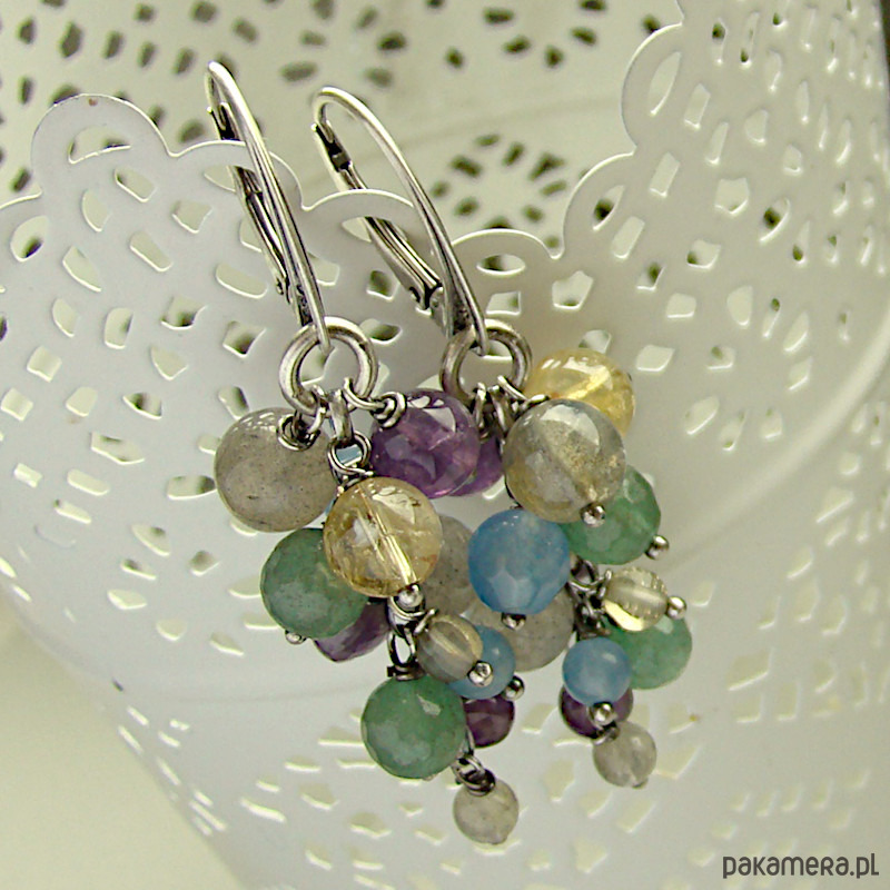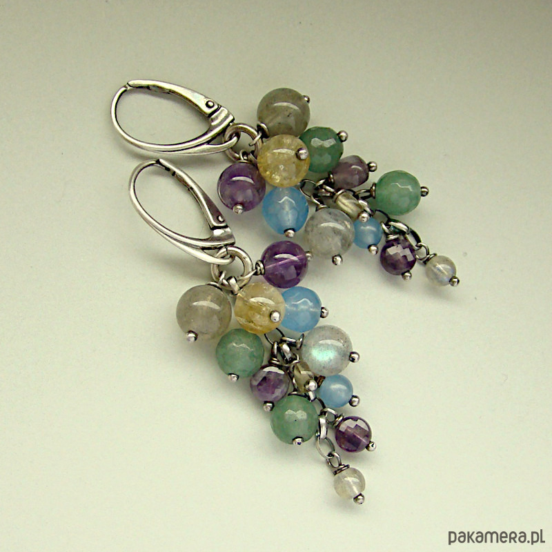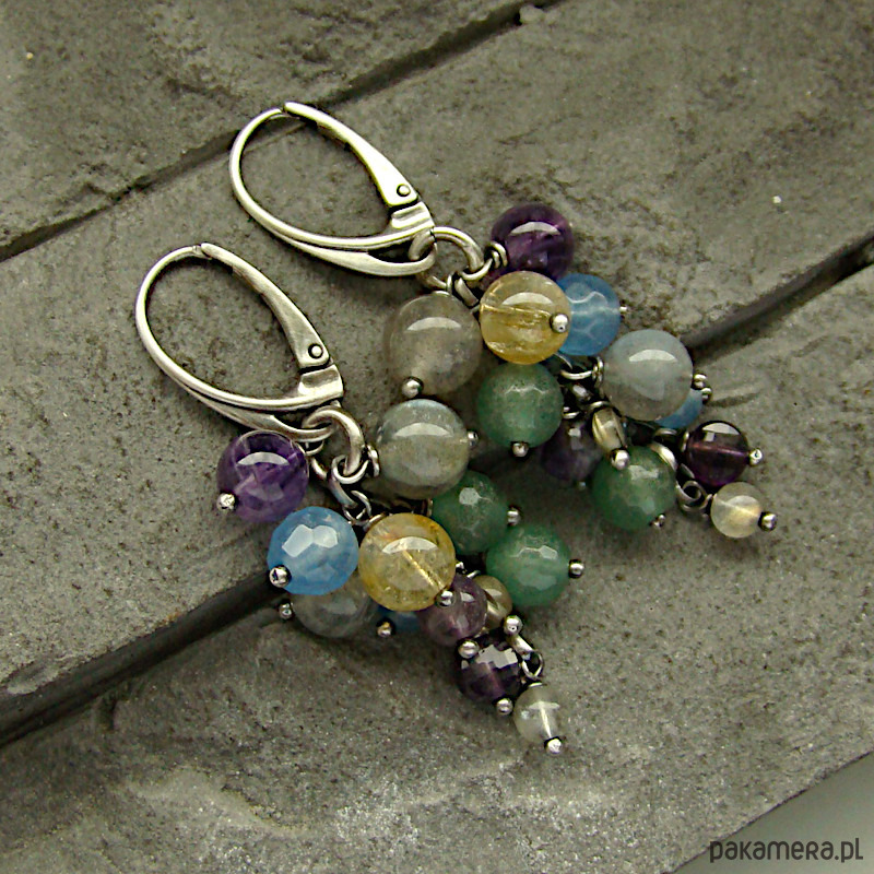 Wiszace, kobiece kolczyki w formie gronek wykonane w całości z oksydowanego srebra próby 925 oraz kamieni ametystu, cytrynu, awenturynu, jadeitu niebieskiego i labradorytu wielkosci 6-4 mm. Bigle angielskie, samozatrzaskowe. Całkowita długość kolczyków to ok. 5,5 cm. W mojej galerii bransoletka do kompletu. Ozdobnie zapakowane.