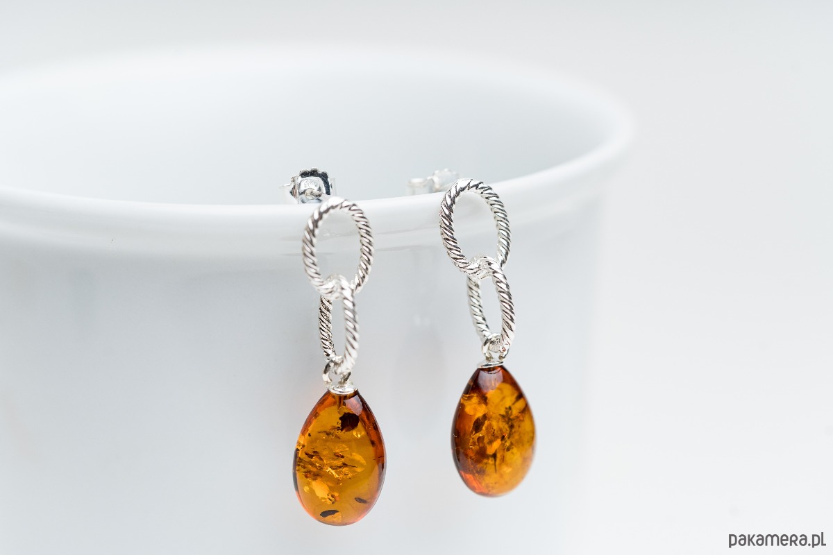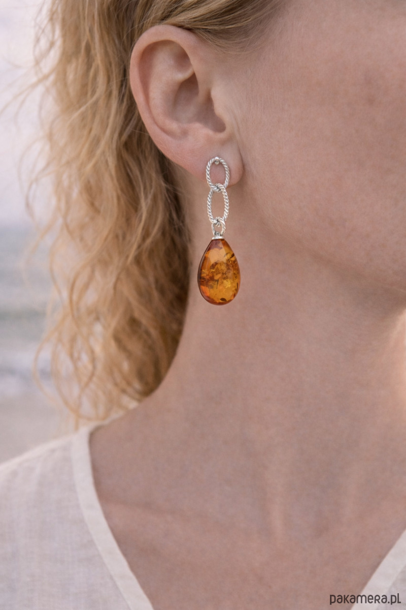 Srebrne kolczyki z bursztynem bałtyckim w kształcie łezek