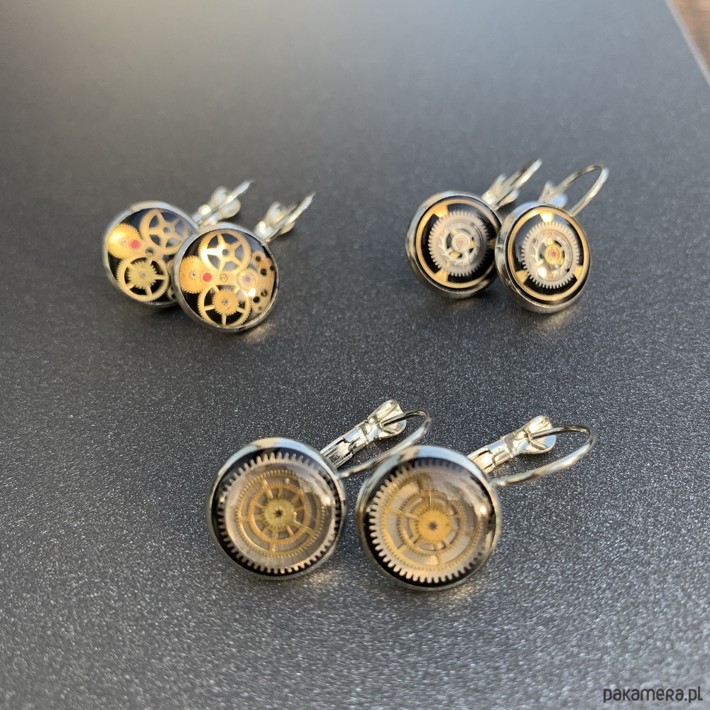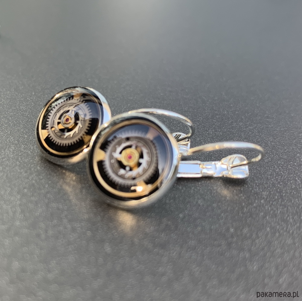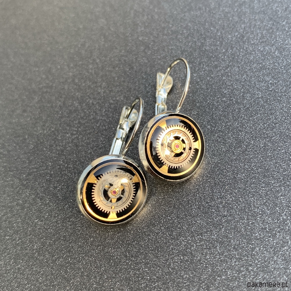 Przepiękne kolczyki posrebrzane, wykonane ręcznie z elementów starych zegarków zatopionych w żywicy. Każda para jest unikalna i niepowtarzalna.