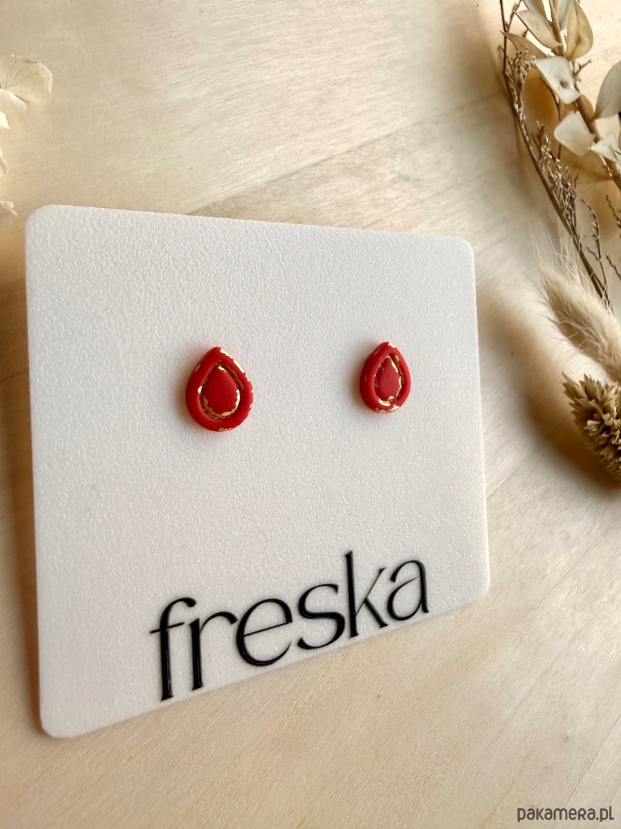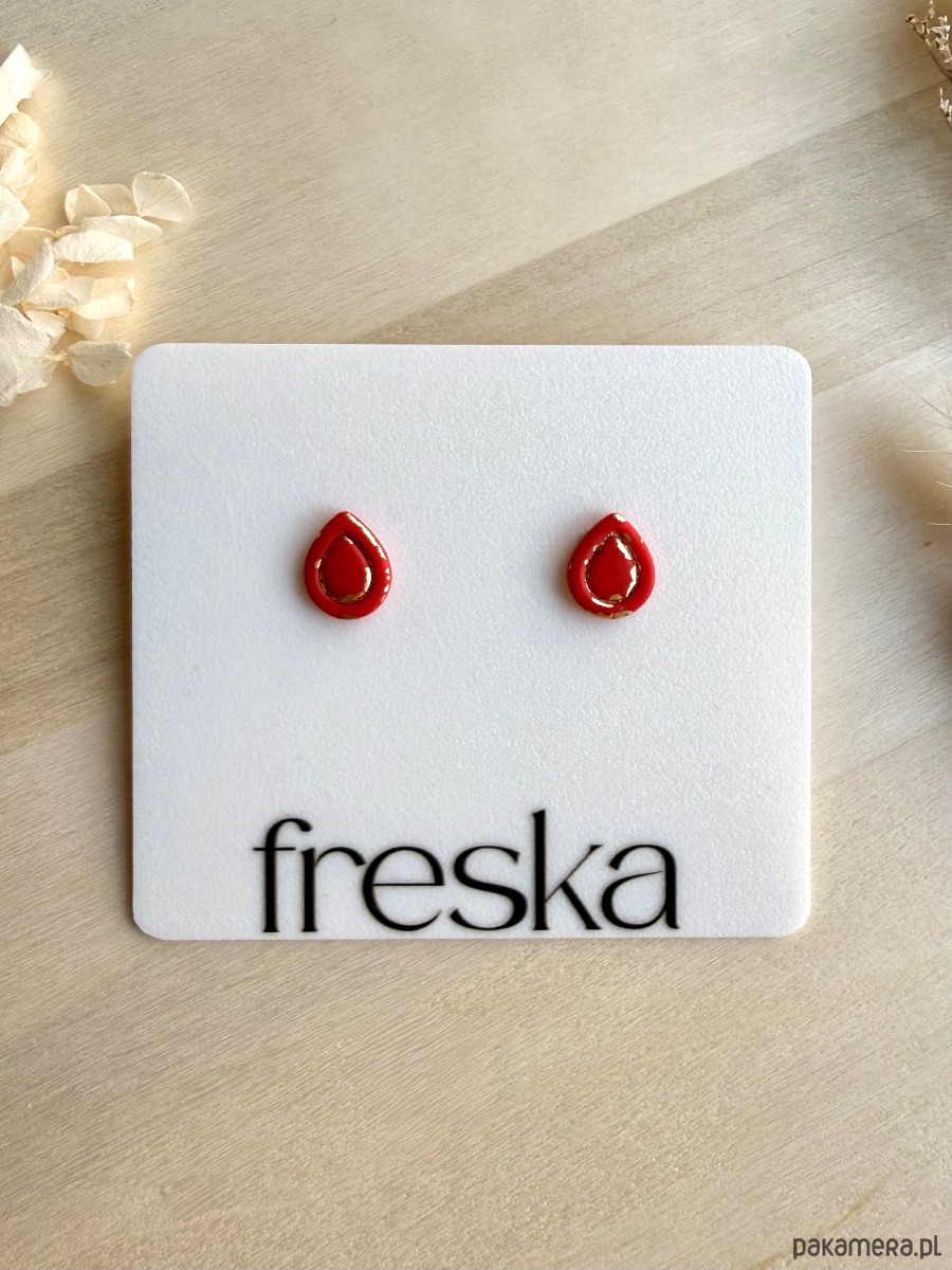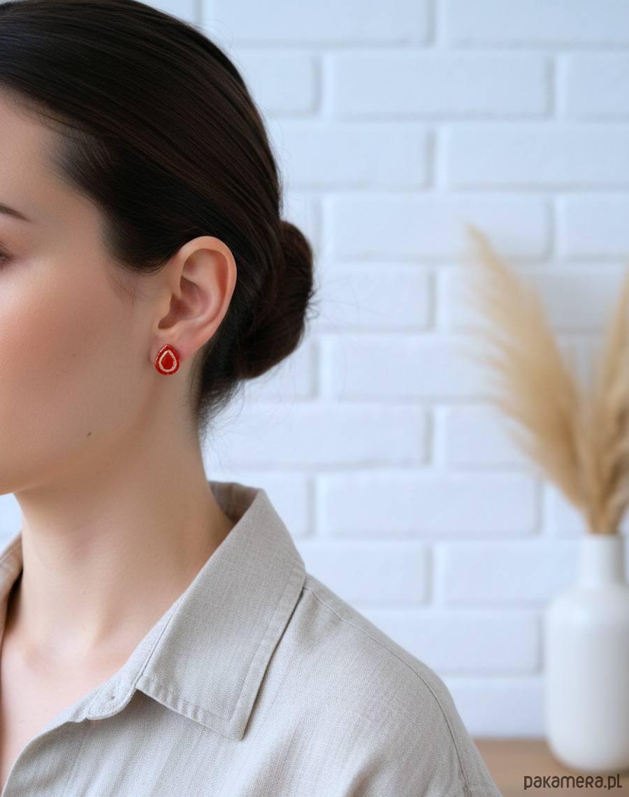 Energia w kropli koloru – minimalistyczne kolczyki–łezki w intensywnej czerwieni ze złotą ramką pięknie ożywią każdą stylizację. Matowy element z metalicznymi dodatkami tworzy wyrazisty środek i obwódkę, a całość osadzono na bazie ze stali chirurgicznej, odpowiedniej również dla wrażliwych uszu.