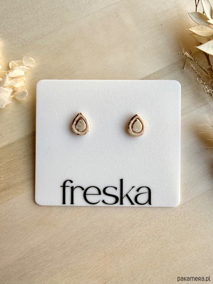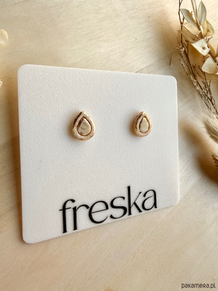 Subtelna elegancja w kropli światła – minimalistyczne kolczyki–łezki w piaskowym odcieniu ze złotą ramką to idealny dodatek na co dzień i na wyjątkowe okazje. Środek z gliny polimerowej o delikatnie marmurkowym wykończeniu został otoczony cienką, metaliczną obwódką, a całość osadzono na bazie ze stali chirurgicznej – odpowiedniej także dla wrażliwych uszu.
