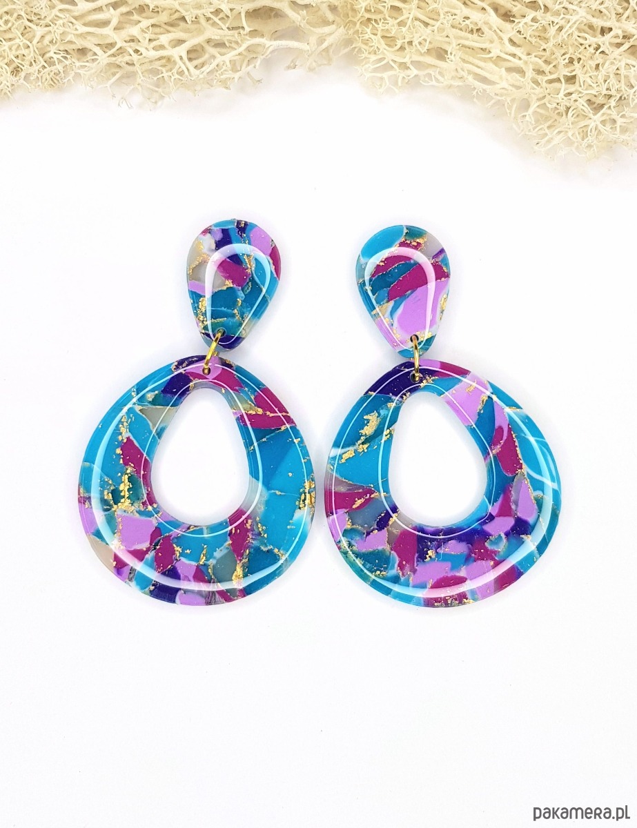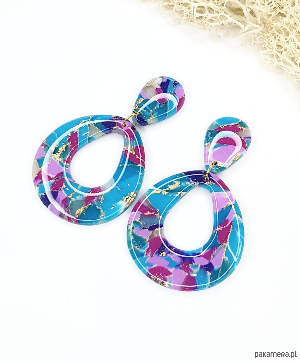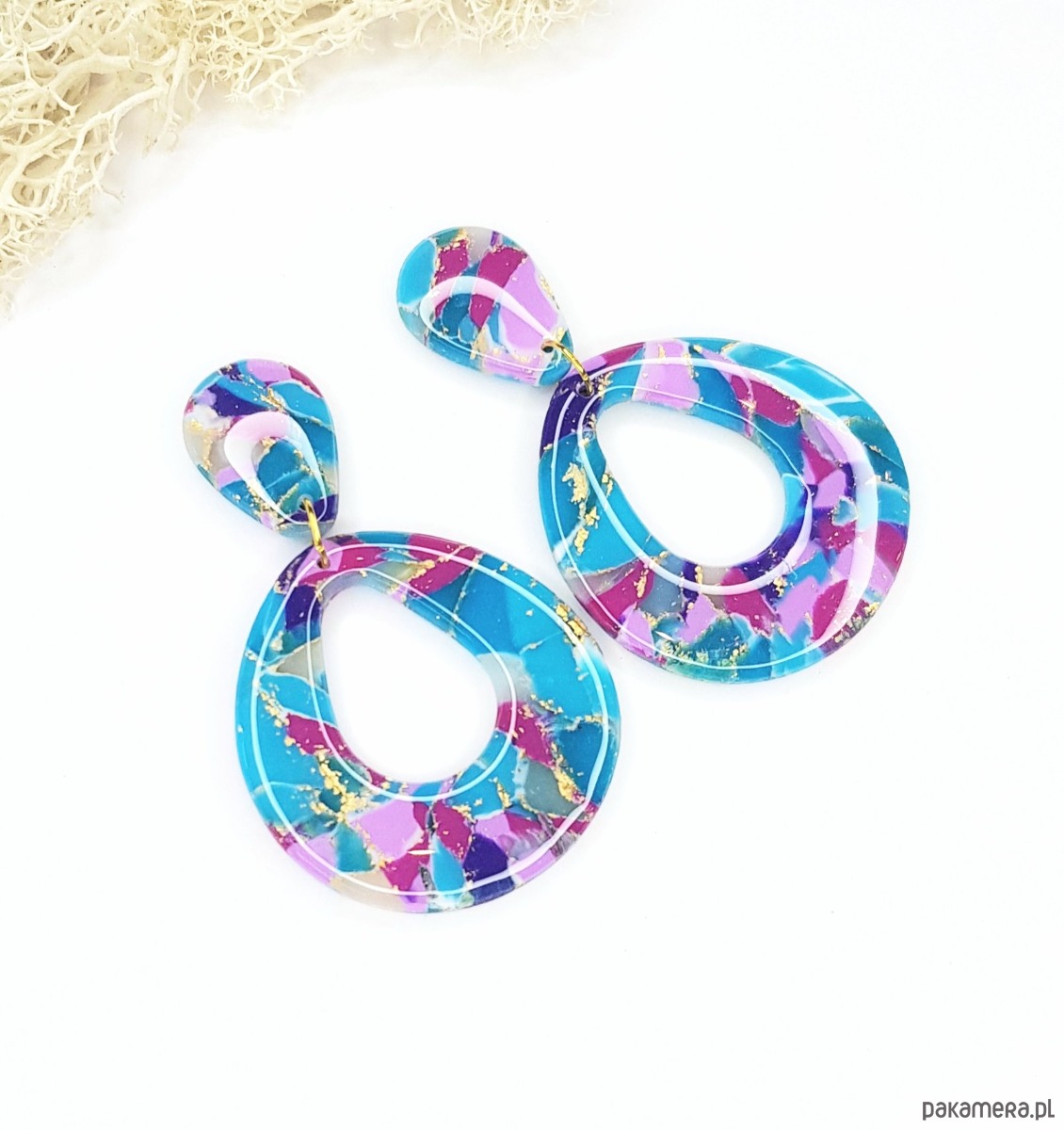 Wypiekane w piecu przewieszki wykonane zostały z profesjonalnej gliny polimerowej w różnych odcieniach turkusu, fuksji i złota.