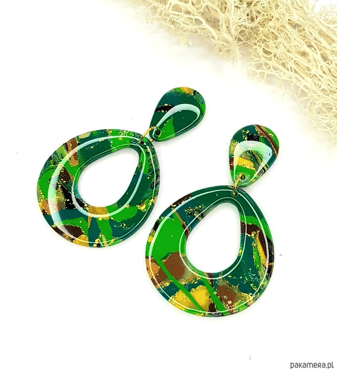 Wypiekane w piecu przewieszki wykonane zostały z profesjonalnej gliny polimerowej w różnych odcieniach zieleni i złota.
