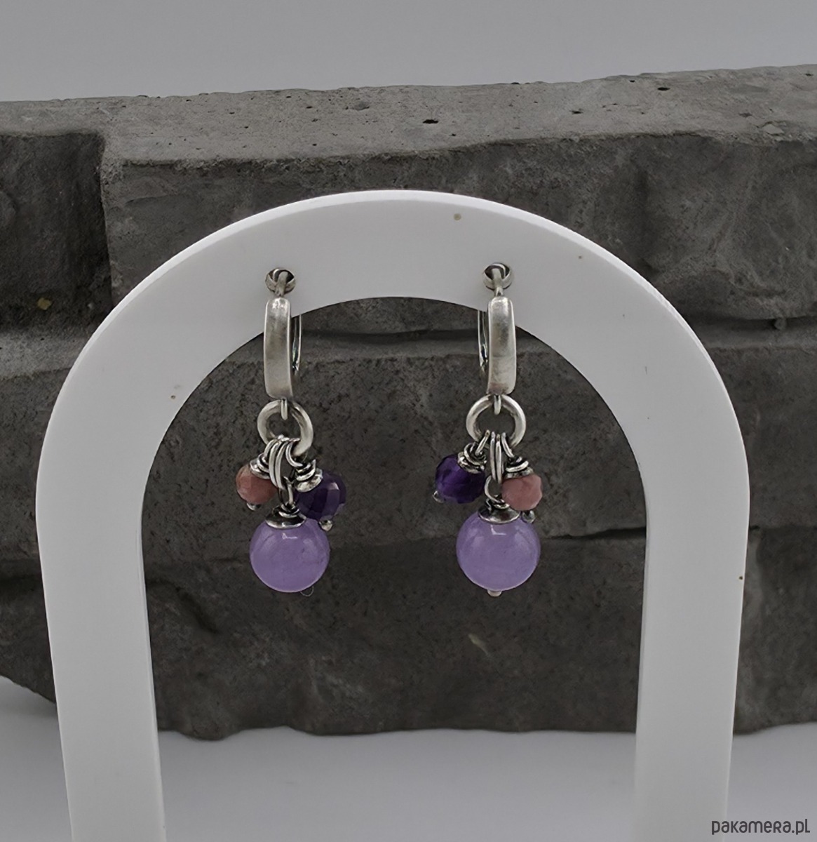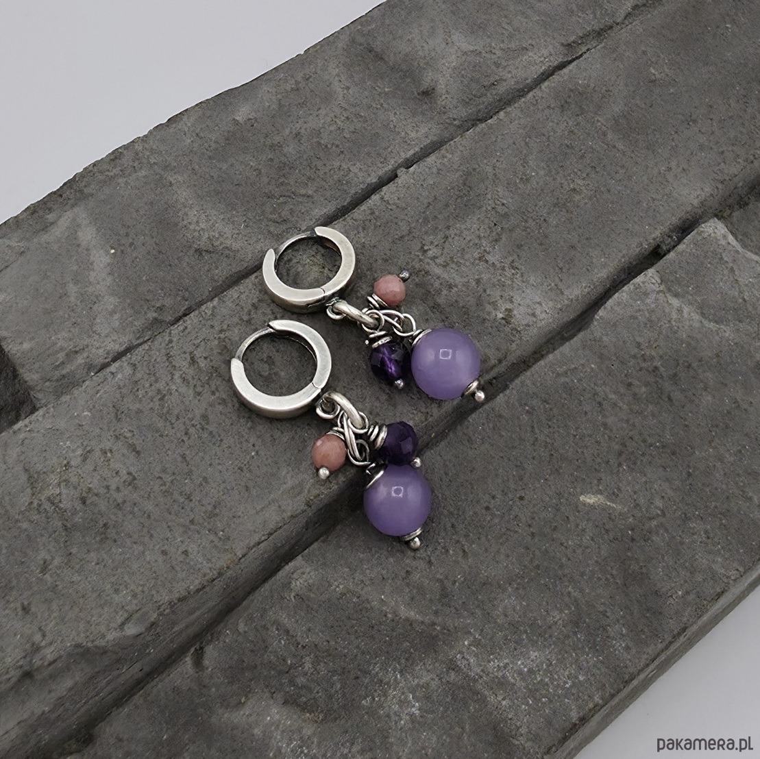 Subtelne i pelne uroku kolczyki na co dzień i nie tylko. Wykonane w całości z oksydowanego srebra próby 925 oraz kulek jadeitu wiekości 8 mm, kulek ametystu 5 mm i 4 mm kulek rodonitu. Moge wykonac podobne z innymi kamieniami. Całkowita długość kolczyków to 3,6 cm. Ozdobnie zapakowane.