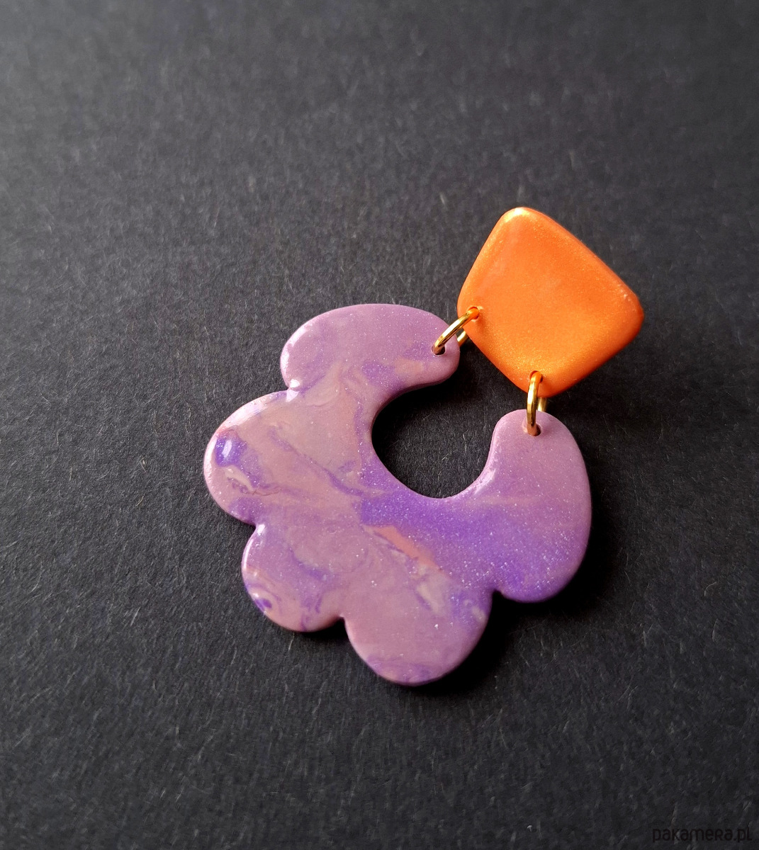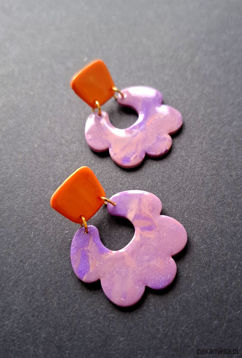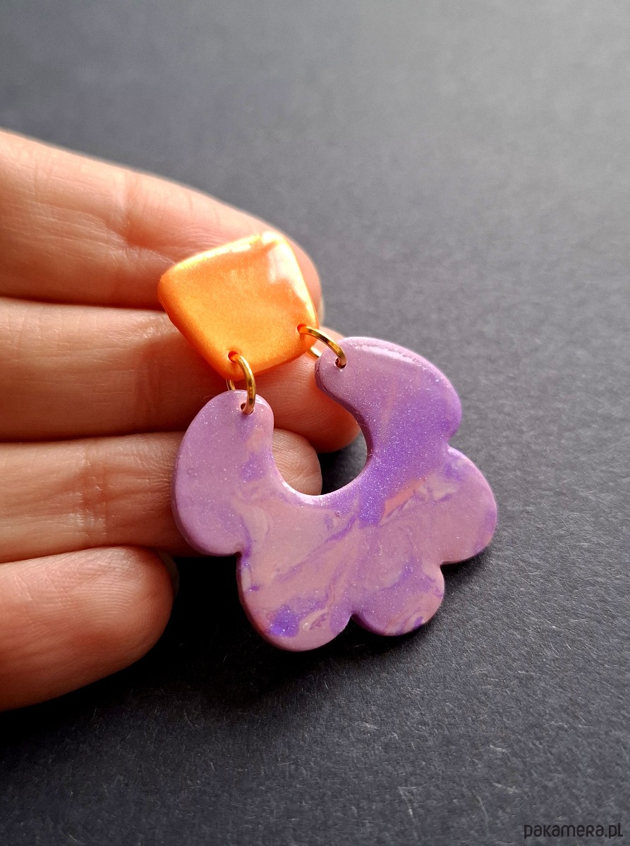 Lekkie kolczyki na sztyfty wykonane z wysokiej jakości glinki polimerowej. Jednostronne z pozłacanymi, nieuczulającymi sztyftami. Wymiary: długość wraz z zapięciem: 4,5 cm; szerokość max. 2,8 cm. Wykonane w jedynym egzemplarzu.