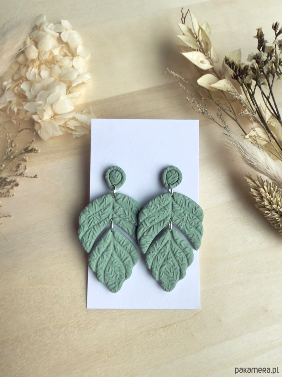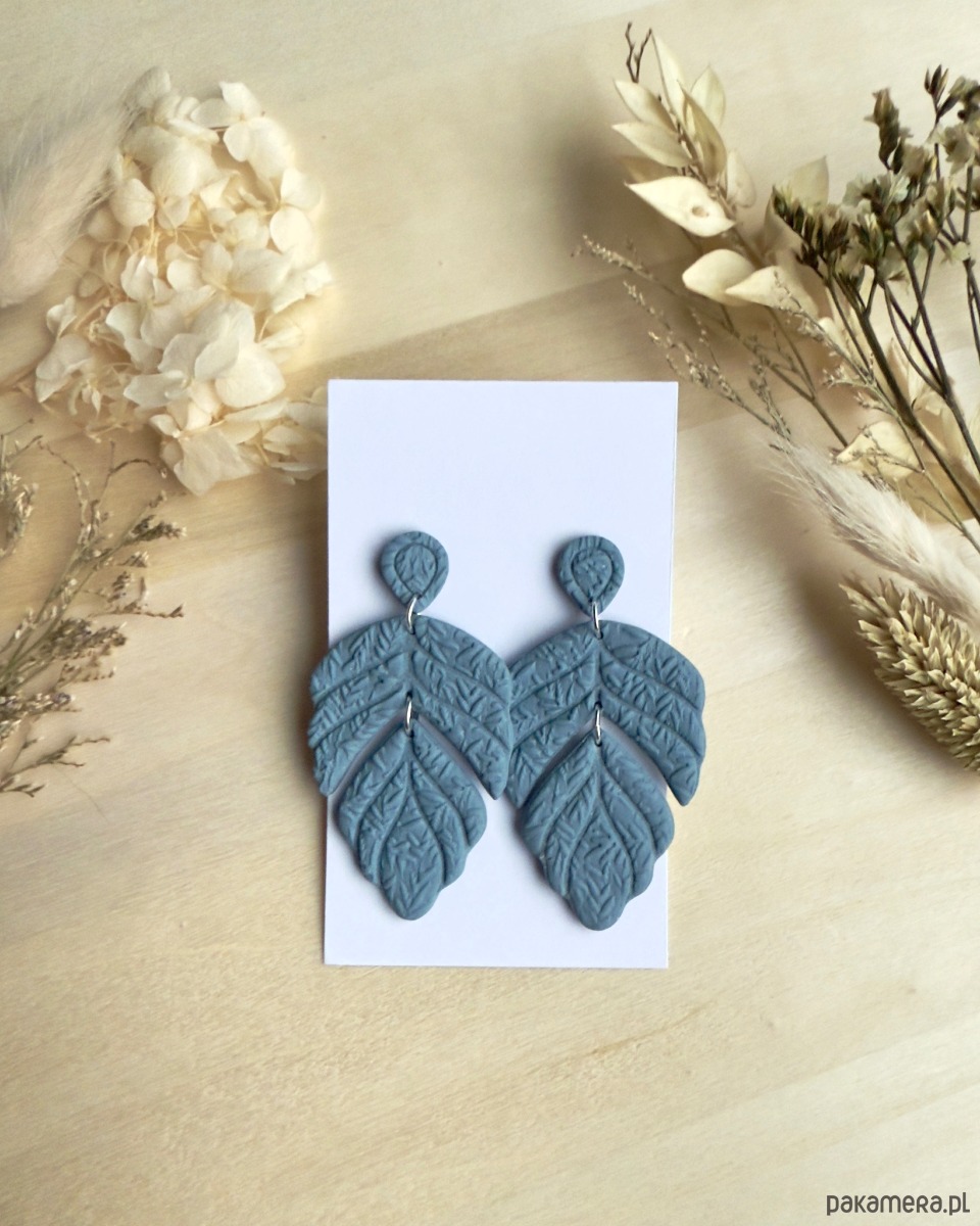 Okazałe kolczyki w kształcie liści o wyjątkowym wzorze, wykonane z gliny polimerowej. Imponujący rozmiar i ciekawa faktura sprawiają, że stanowią niebanalny akcent każdej stylizacji.