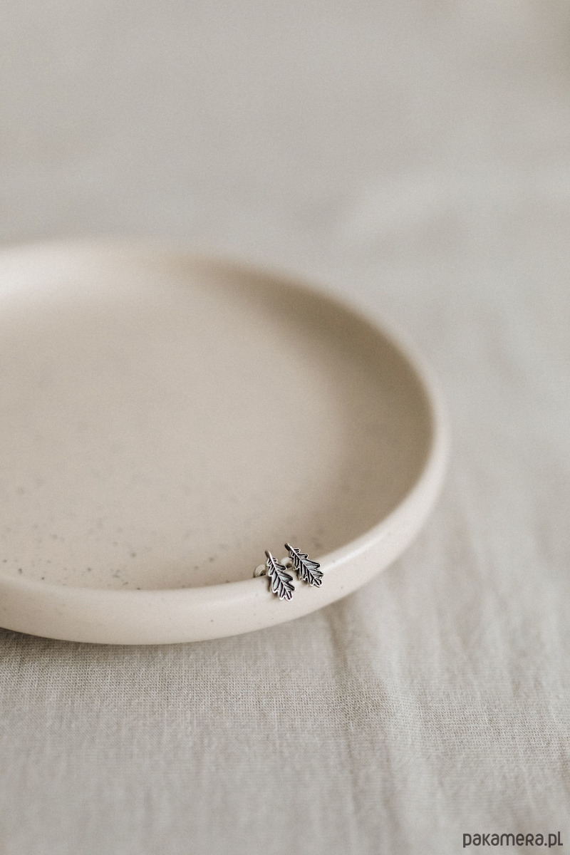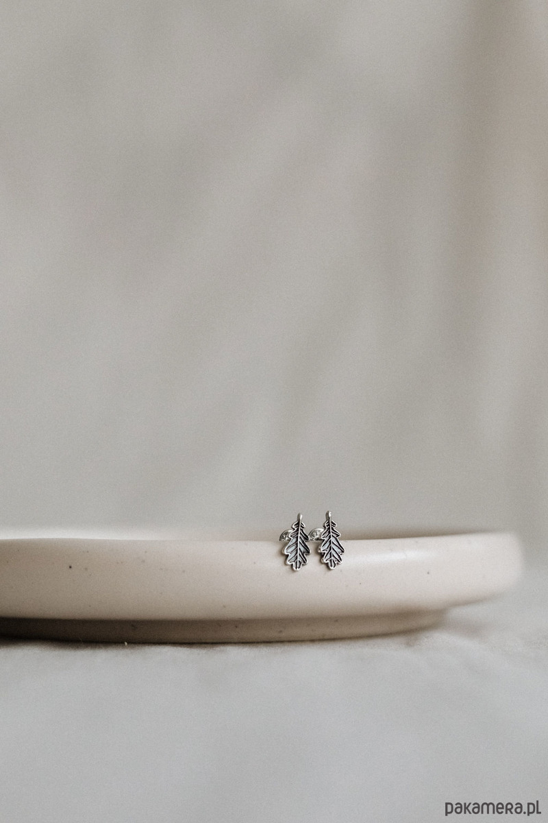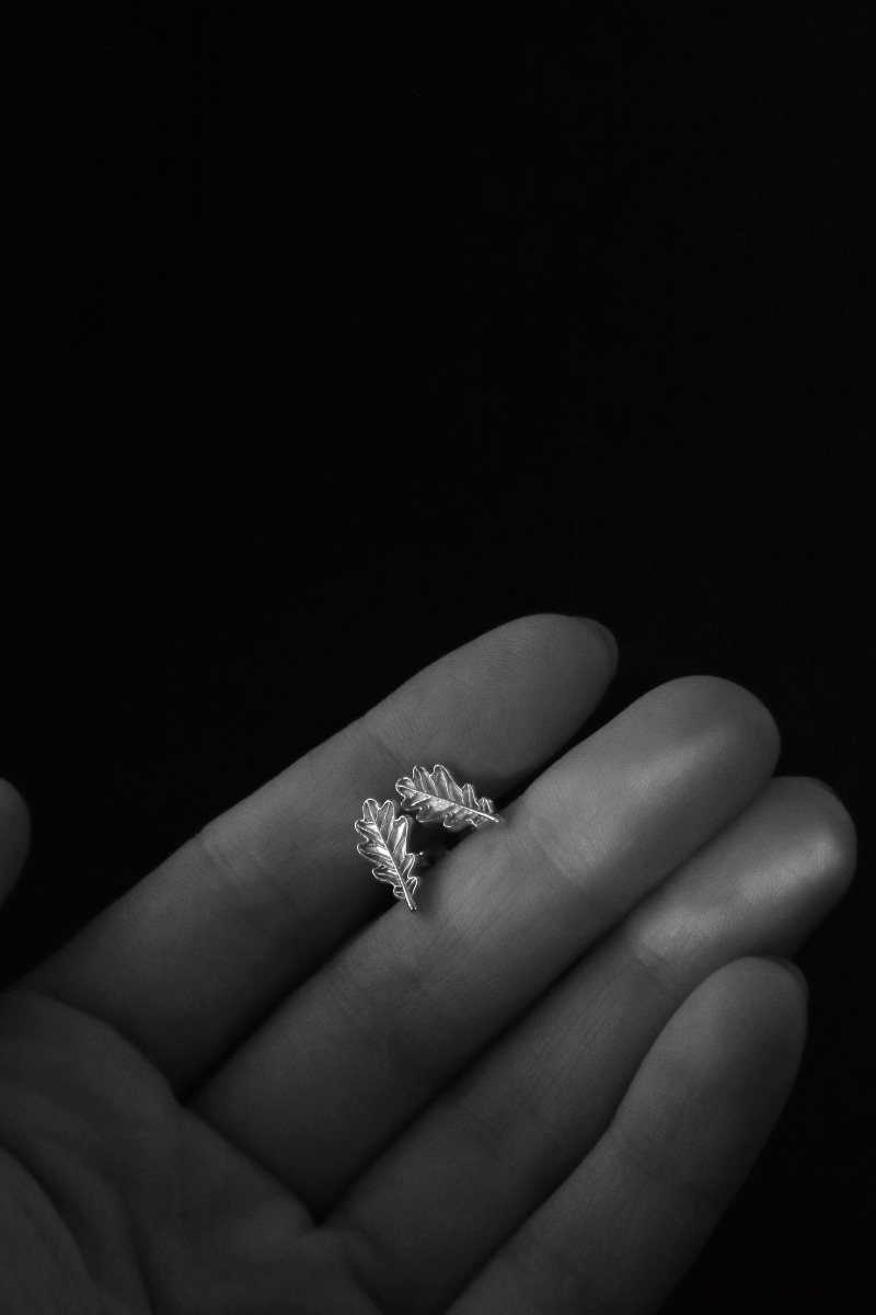 Te drobne, urocze kolczyki zaprojektowałam tak, żeby możliwie najwierniej odwzorować detale prawdziwych liści dębu. Kształt, brzeg blaszki liściowej, unerwienie. Są one ukłonem w kierunku wszystkich, którzy lubią obserwować piękno roślinnych szczegółów. Kolczyki zaprojektowałam od szkicu na papierze, nadzorowałam odlew i wykończenie.