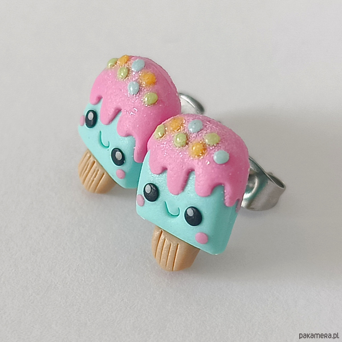 Słodkie pastelowe kolczyki w kształcie lodów na patyku – idealne dla miłośników uroczej biżuterii! Wykonane ręcznie z masy polimerowej, ozdobione brokatową posypką i różowym "lukrem" oraz uśmiechniętymi buźkami – to idealny dodatek na lato.