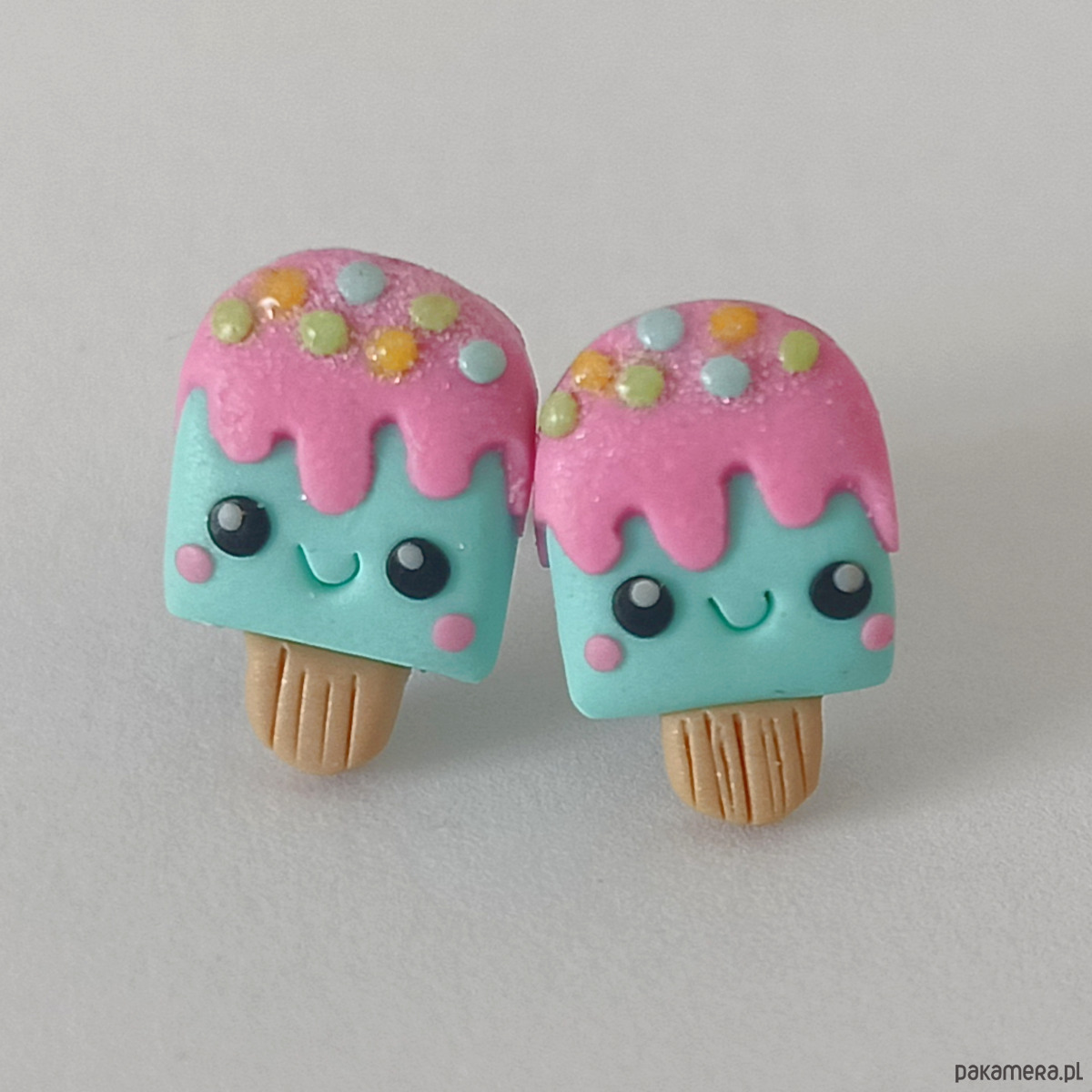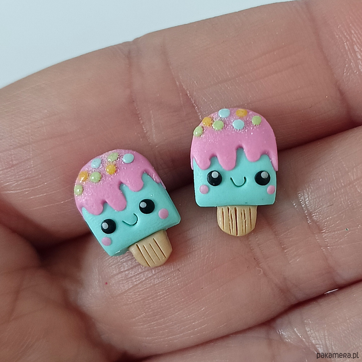 Słodkie pastelowe kolczyki w kształcie lodów na patyku – idealne dla miłośników uroczej biżuterii! Wykonane ręcznie z masy polimerowej, ozdobione brokatową posypką i różowym "lukrem" oraz uśmiechniętymi buźkami – to idealny dodatek na lato.