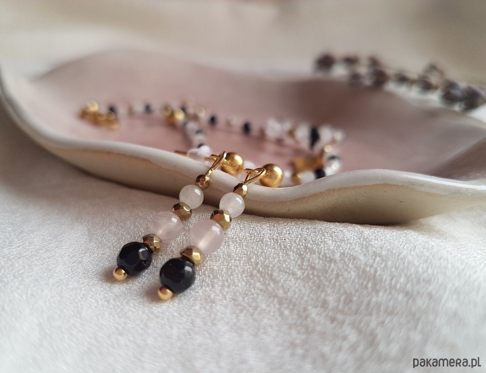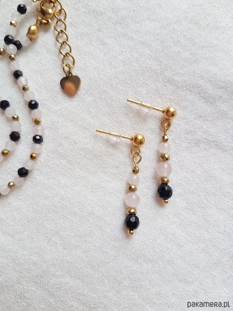 Kolczyki wiszące z Kwarcem Różowym oraz Czarnym Turmalinem